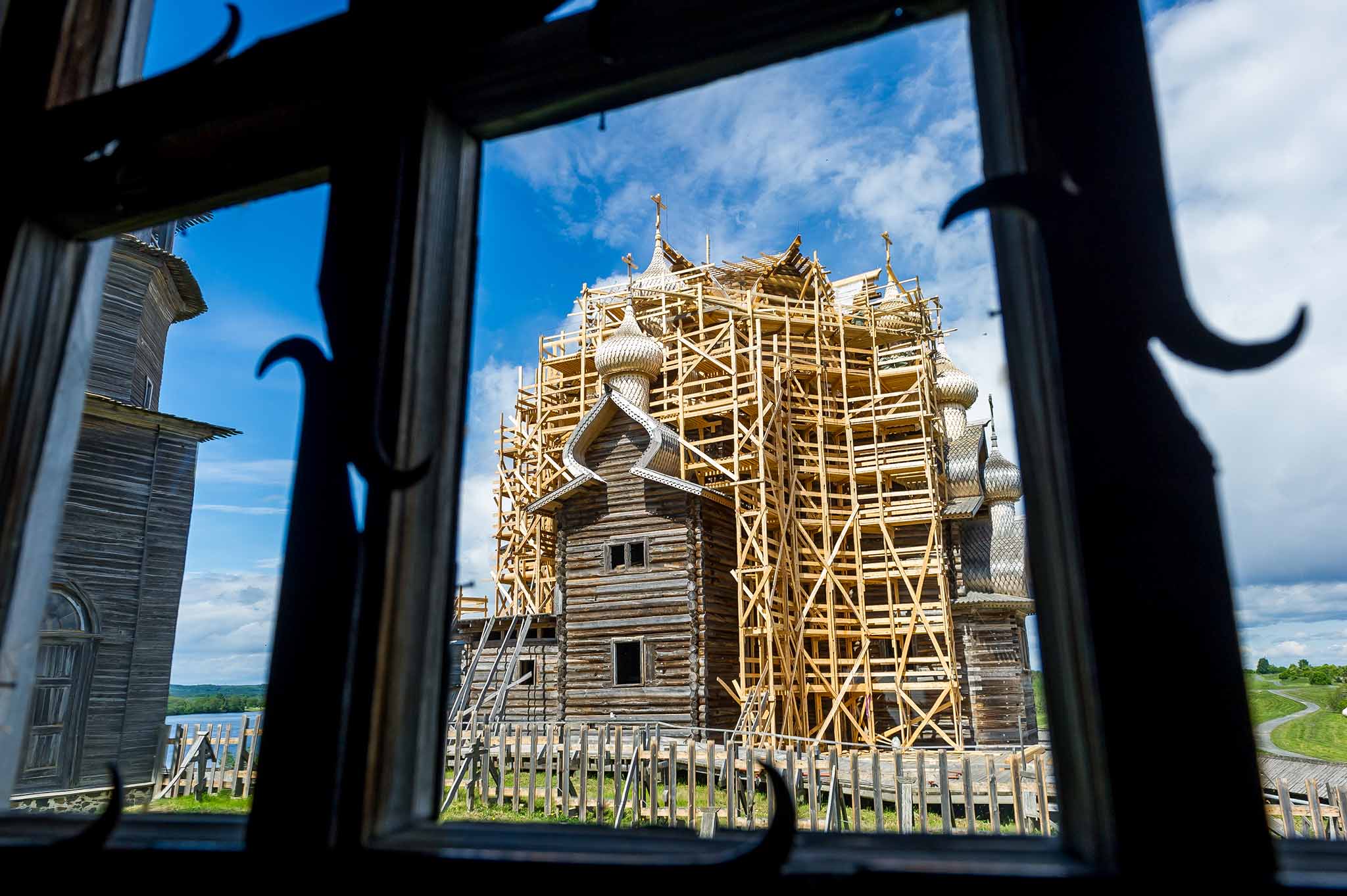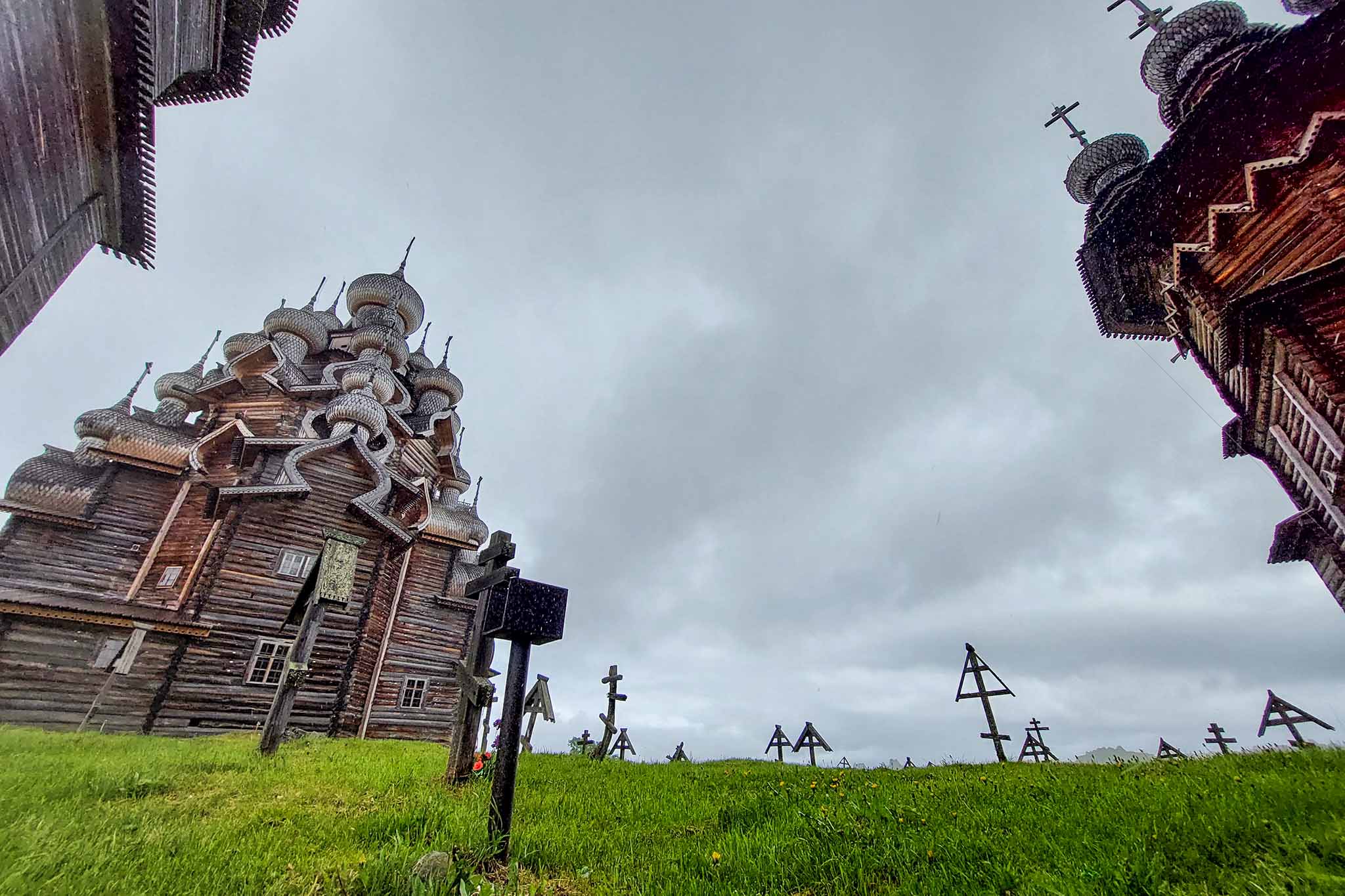Когда-то на Кижах было 18 подобных храмовых комплексов, но до сегодняшних дней уцелел лишь один. В XIX веке срубы обеих церквей кижского погоста обшили тесом, а серебро осинового лемеха на куполах скрылось под листами железа. В таком виде они простояли 150 лет.