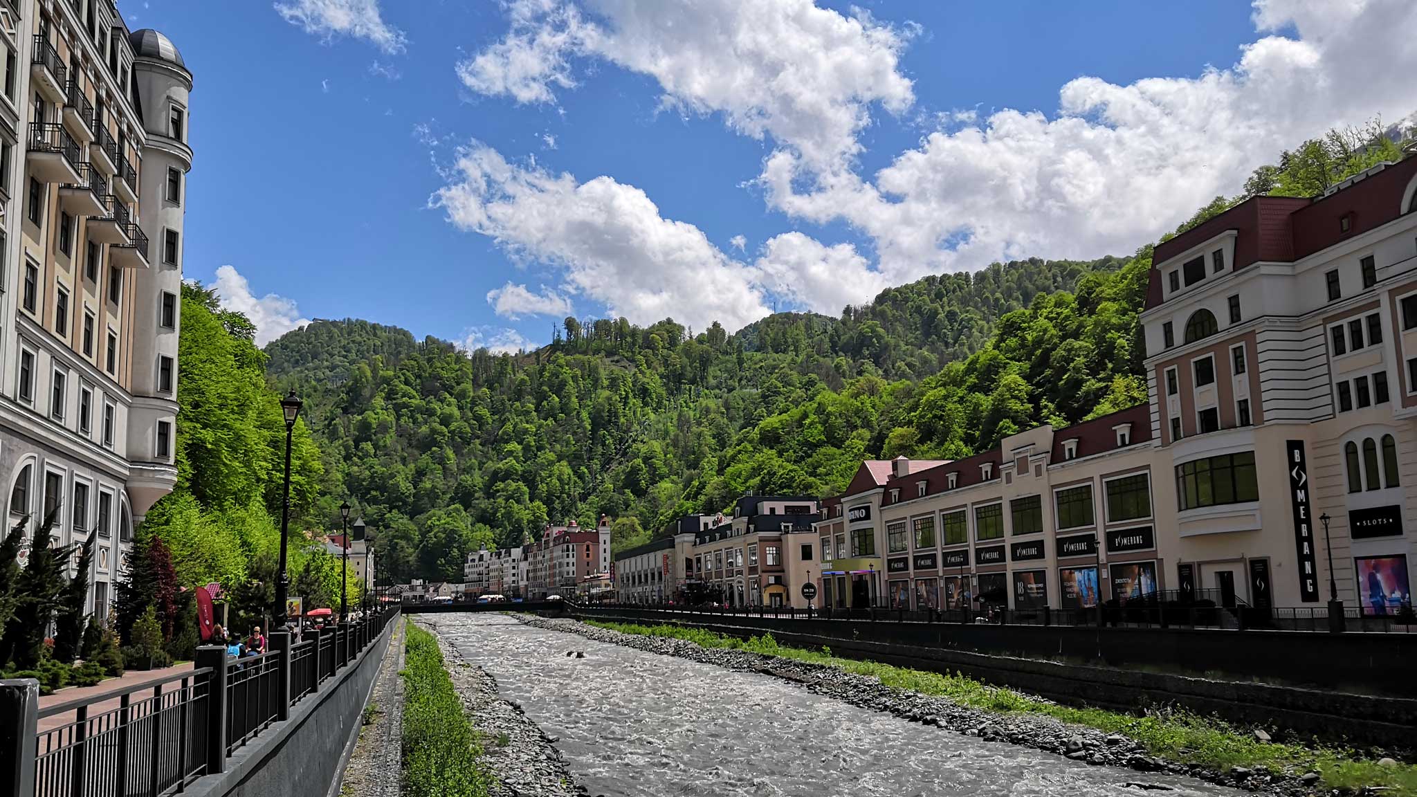 Наверняка большая часть фотографий горнолыжного Сочи в соцсетях, которые вы видели, именно отсюда. Курортная зона расположена на нескольких уровнях, от реки Мзымта до панорамных площадок на высотах 2230 и 2509 метров. Это красиво уже само по себе. А еще тут отели и набережная, кафе и панорамные площадки, напоминающие европейские деревеньки.