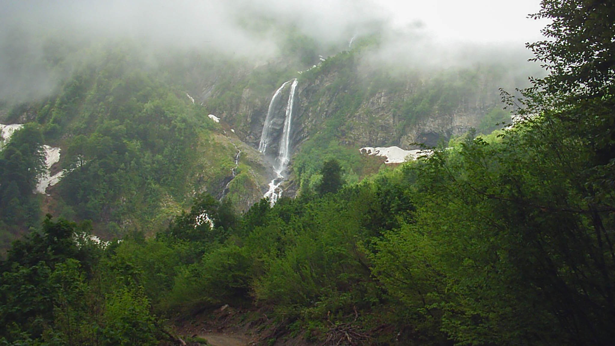 Однако в мае картина разительно меняется — водопад становится наиболее полноводным. Именно в это время становится понятным его прозвище — обе «штанины», белые от вспененной воды, ярко выделяются на фоне зеленеющего склона. Альпийские луга покрываются цветами.