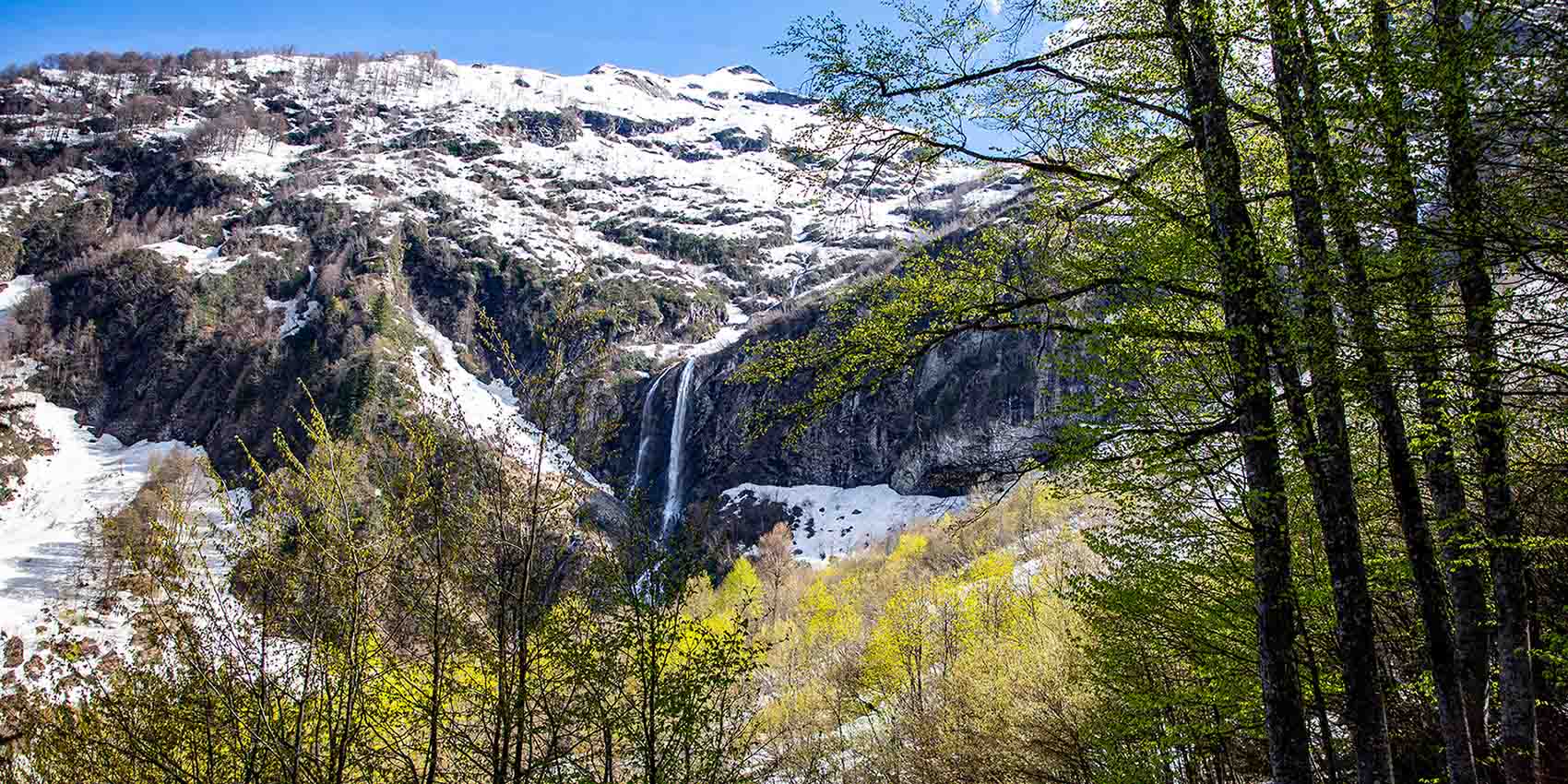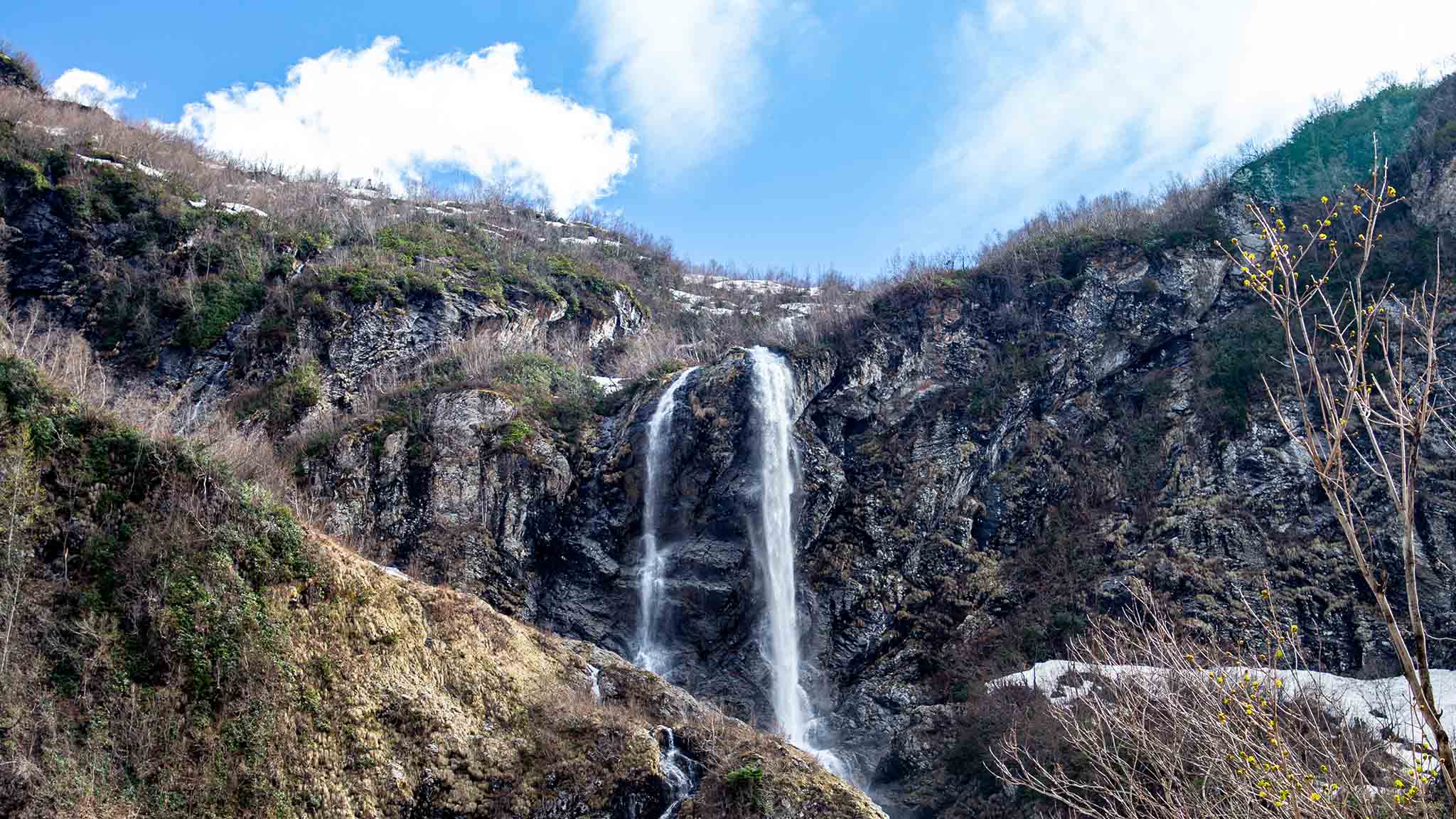 Однако в мае картина разительно меняется — водопад становится наиболее полноводным. Именно в это время становится понятным его прозвище — обе «штанины», белые от вспененной воды, ярко выделяются на фоне зеленеющего склона. Альпийские луга покрываются цветами.