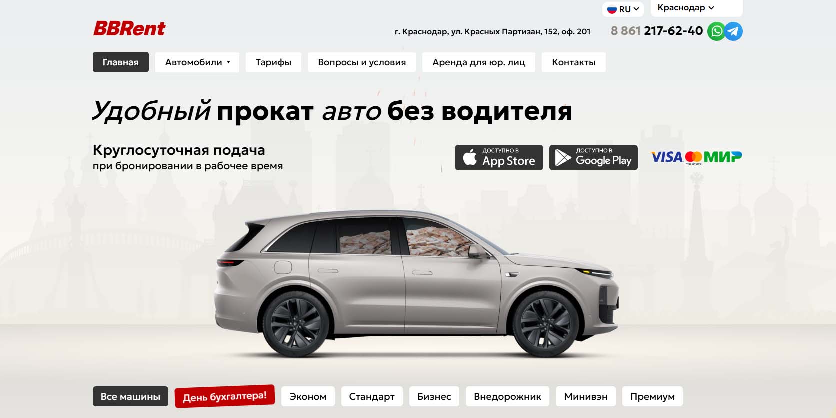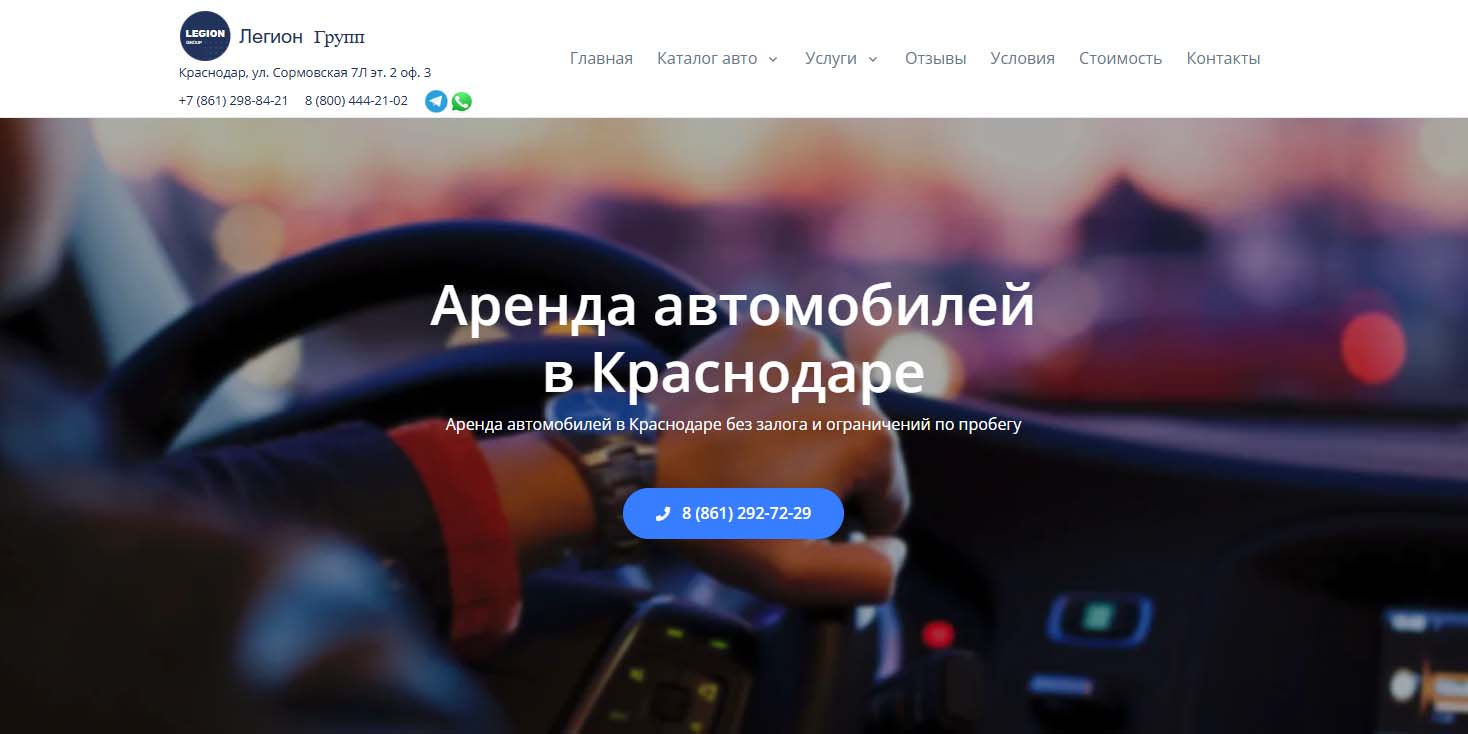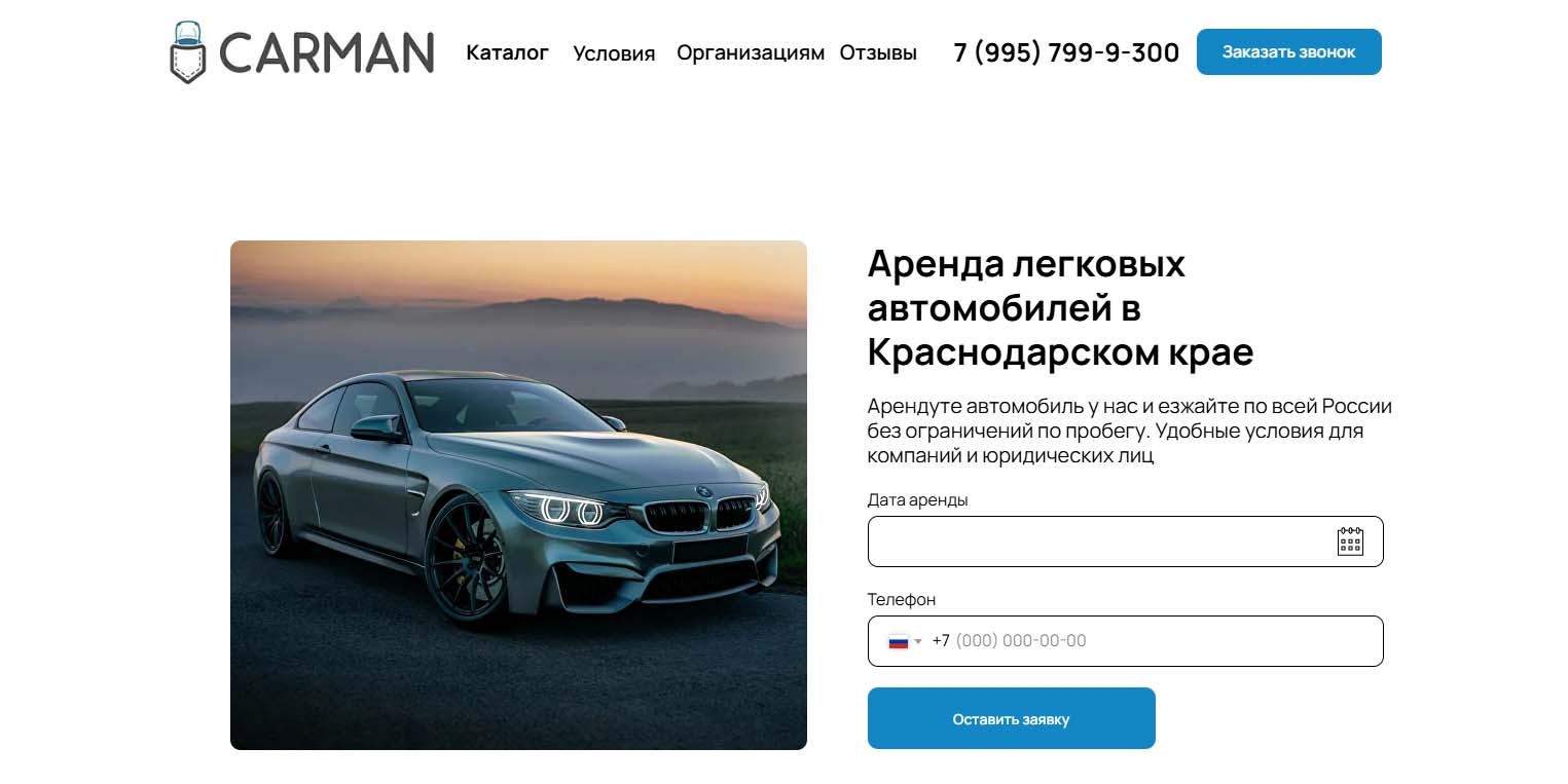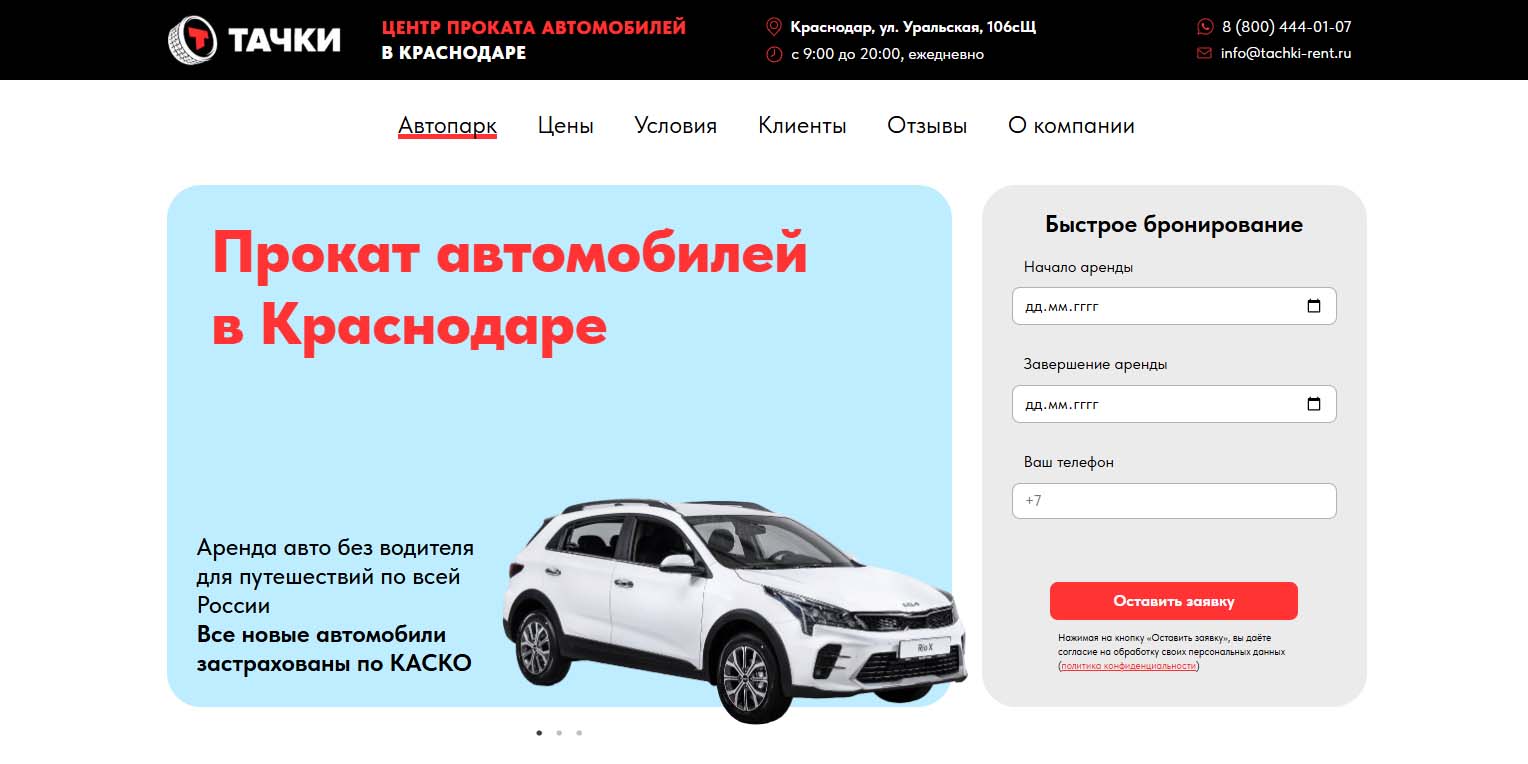 Компания работает с физическими и юридическими лицами на территории Краснодара. Можно арендовать автомобиль с водителем и без него. В автопарке есть модели эконом-, комфорт- и премиум-класса. По запросу предоставляются детские люльки, кресла, бустеры, крепления для лыж и сноубордов. Клининг, дезинфекция и техобслуживание проводятся после каждого клиента. Минимальный срок аренды — 5 дней.