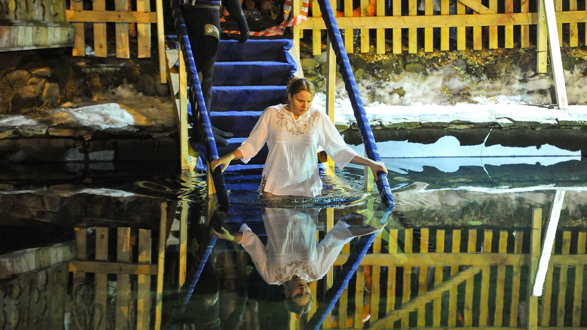 Мужчинам традиционно советуют заходить в воду в длинных рубахах, женщинам — в просторных платьях или сорочках.
