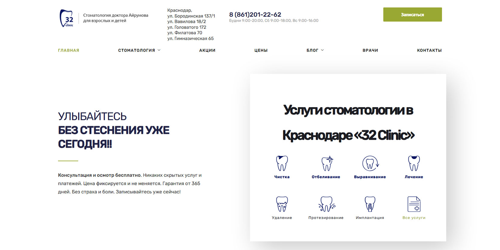 Эта сетевая стоматология работает с 2011 года — в Краснодаре есть 5 клиник. В стоматологии представлен весь спектр услуг: терапия нарушенного роста зубов, установка пломб и удаление зубов. Лечат кариес любой сложности, в том числе периодонтит, а также начальный кариес в стадии «белого пятна». Первичный осмотр и консультация бесплатны, для детей есть игровая комната.