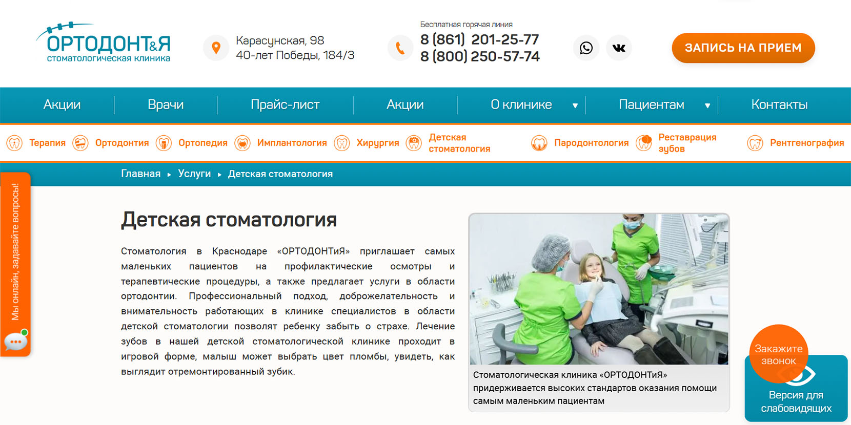 Сетевая стоматология начала работу в 2003 году. Детское отделение предлагает ознакомительный прием, но если все же малыш боится или предстоит обширное лечение, можно провести его «во сне». Кариес лечат под микроскопом, чтобы устранить даже скрытое поражение зуба, используют современные методики для исправления прикуса, проводят безболезненную гигиену полости рта. В 2025 году стоматология заняла первой среди сетевых клиник Краснодара в рейтинге профильного журнала. На базе стоматологии есть учебный центр для врачей, клиника следит за всеми новшествами в мире стоматологии.