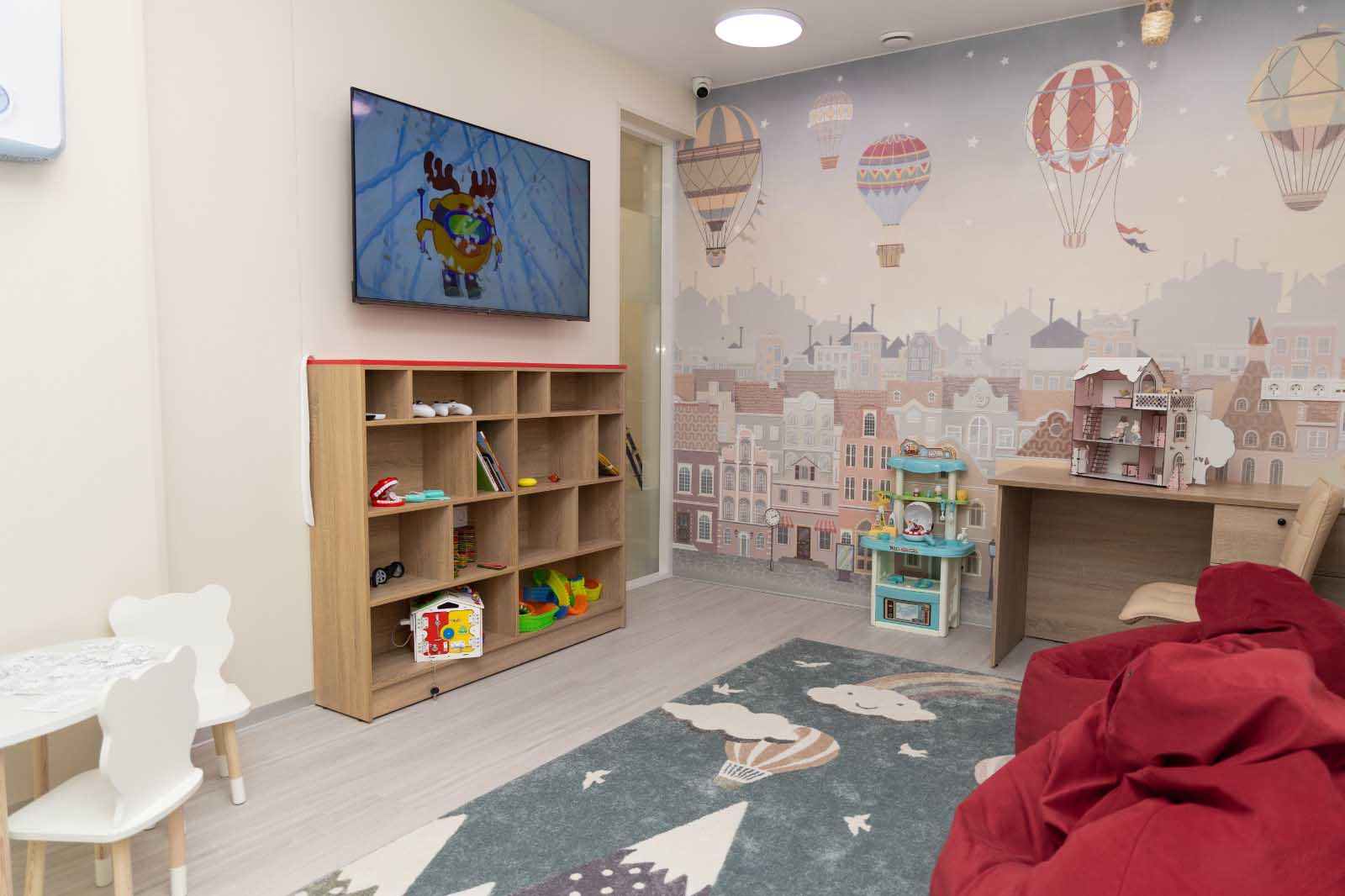Чтобы визит прошел спокойно и комфортно, перед приемом можно побывать в уютной игровой комнате. А во время лечения маленький пациент прямо в кресле посмотрит любимые мультики, пока доктор будет занят восстановлением здоровья детских зубов.