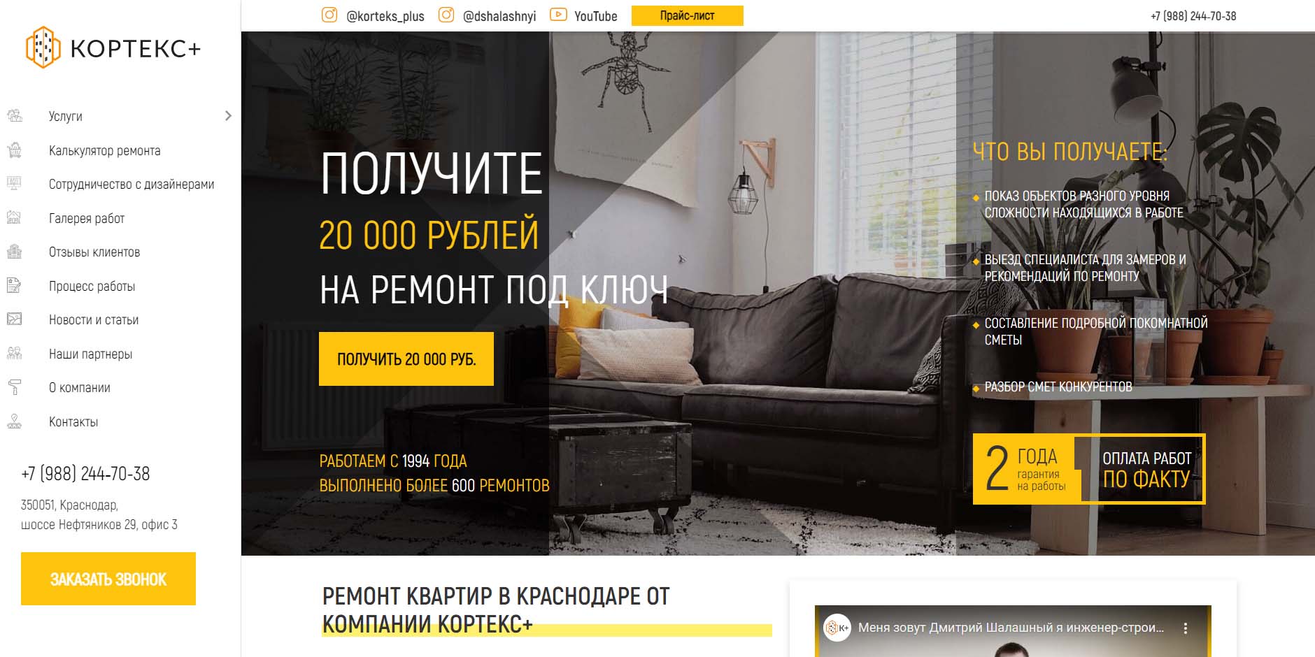 С 2014 года компания выполнила сотни проектов «под ключ» разного масштаба — квартиры, коттеджи, коммерческие помещения. Ремонтные работы выполняются под контролем прораба и при соблюдении ГОСТ и СНиП, для спокойствия заказчика ведутся онлайн-трансляции и отчеты. Компания несет материальную ответственность за имущество, сроки и строительные материалы. По окончании ремонта выполняются клининговые работы. При необходимости могут провести экскурсию на текущий объект, чтобы увидеть вживую работу специалистов.