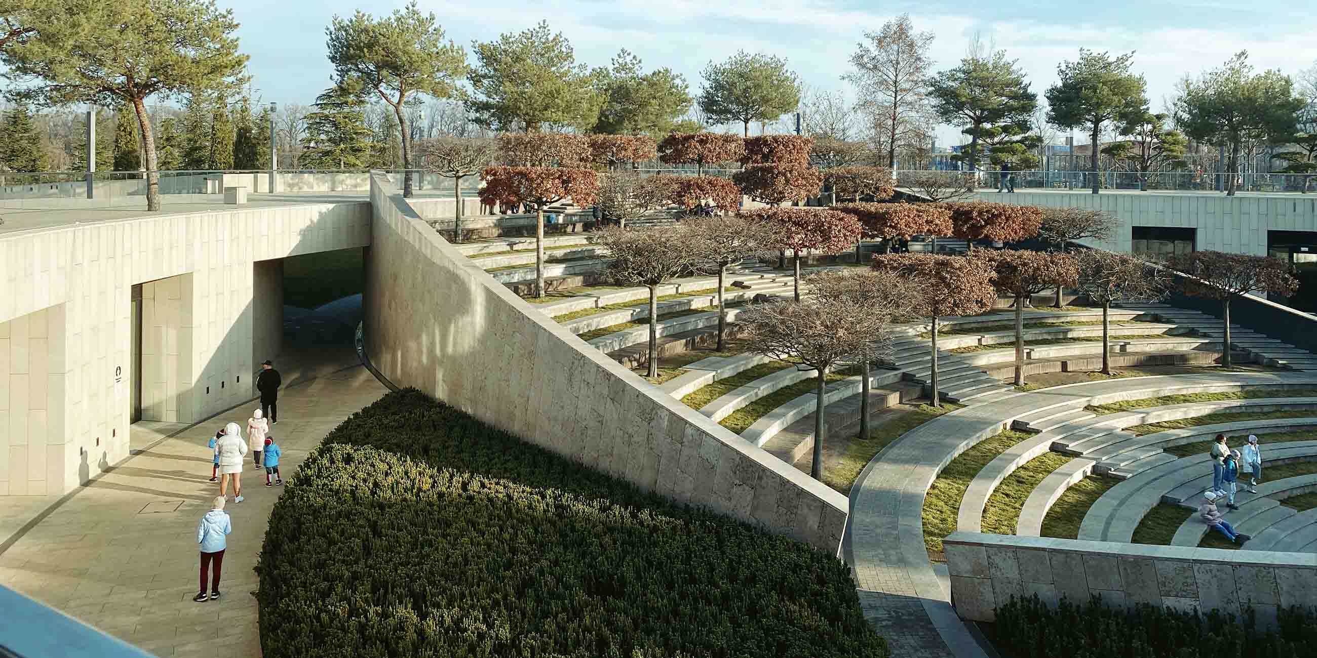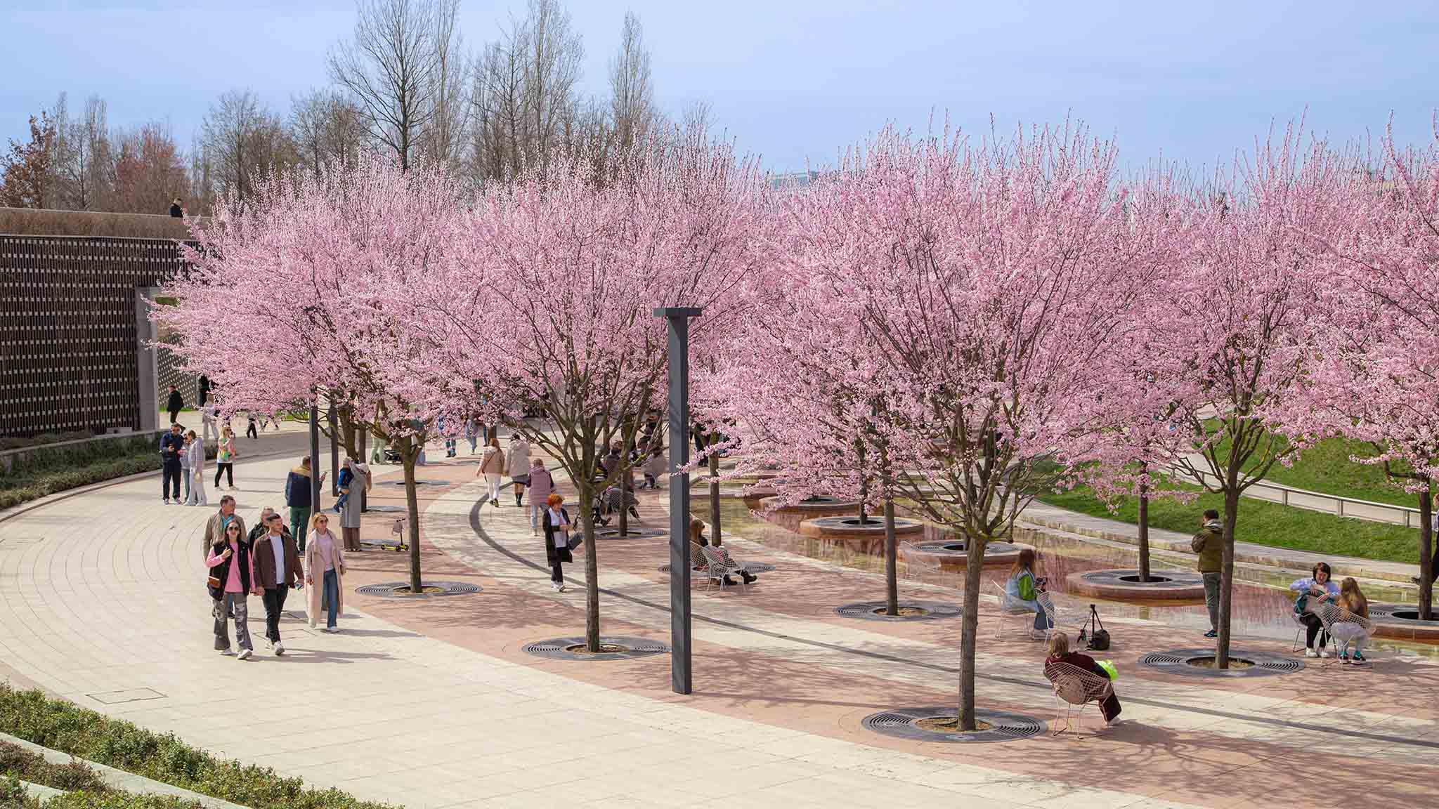 Французский сад — собрание симметричных оазисов с кленами и огибающими декоративные кадки лавочками. От других зон сад отделяют зеленые изгороди с повторяющимися модульными элементами.