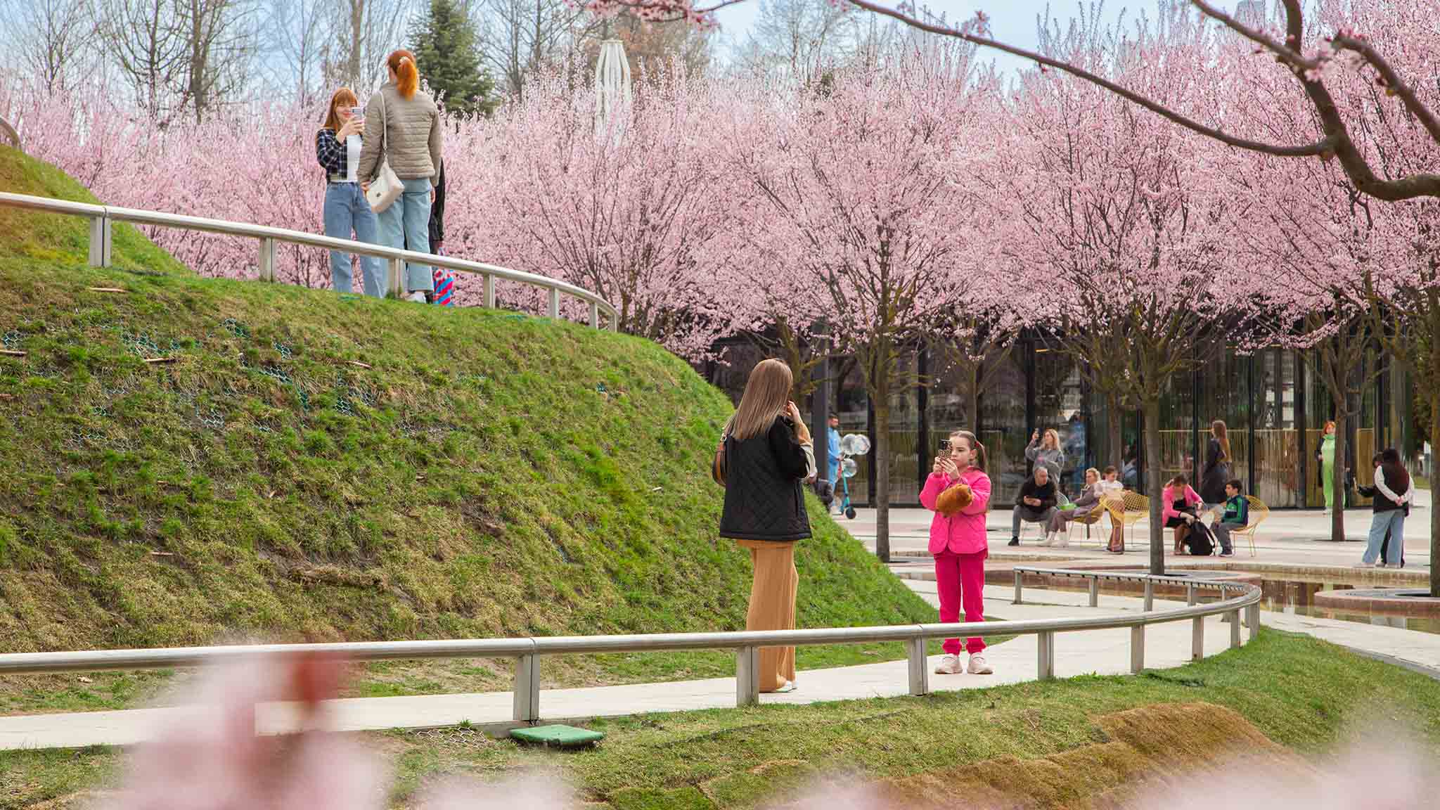 Важно, что парк — не декорация, а многофункциональная площадка для семейного отдыха. В летнем амфитеатре проводят концерты и показывают кино под открытым небом. Для активных игр оборудованы ролледром, скалодром, веревочный парк и площадка для уличного баскетбола. Перекусить можно в бургер-баре и кафе.