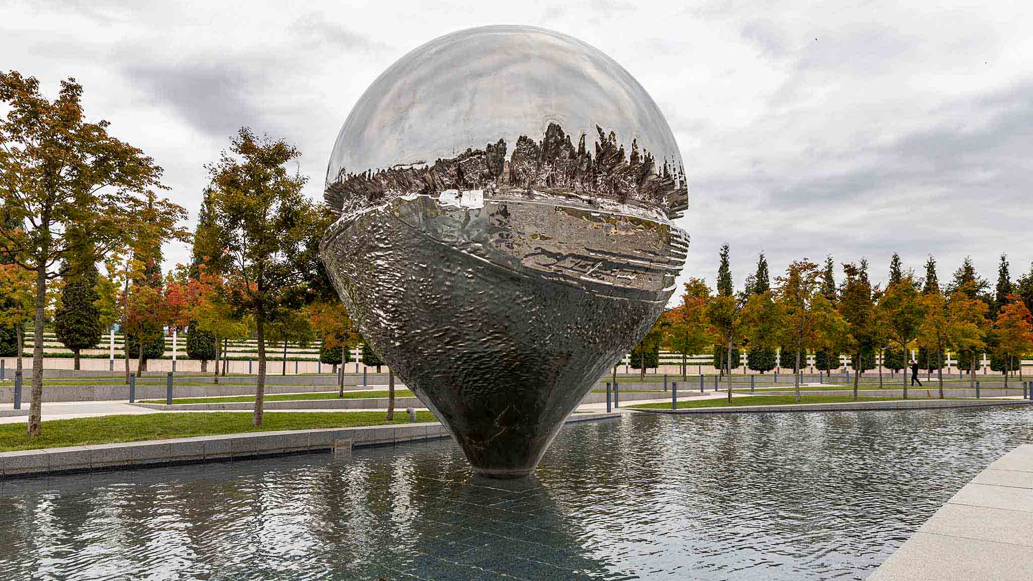 Пятиметровая «Перевернутая капля» из нержавеющей стали отождествляет долю секунды, застывшую в металле. Арт-объект стоит в неглубоком бассейне и носит еще одно название — «Геолокация», потому что выглядит как отметка на карте. Зеркальная поверхность капли отражает панораму именно того места, с которого на нее смотрит наблюдатель.