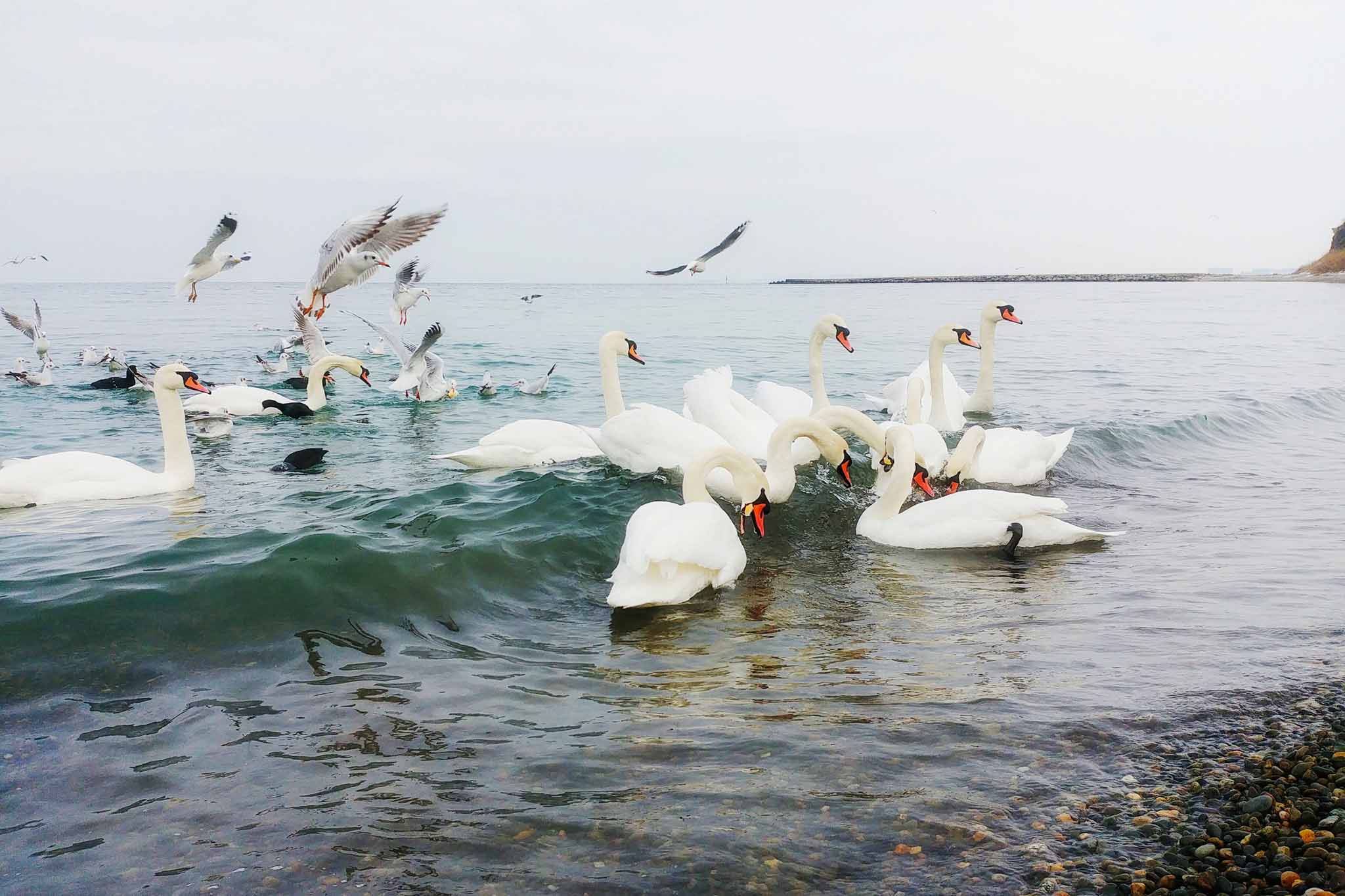 Величественные белые птицы прилетают на побережье, радуя местных жителей и туристов. Полюбоваться на них приезжают даже из Краснодара, а у детей кормление птиц оставляет неизгладимое впечатление. Лебеди с удовольствием едят белый хлеб, сухари без добавок, крупу и нарезанные овощи.