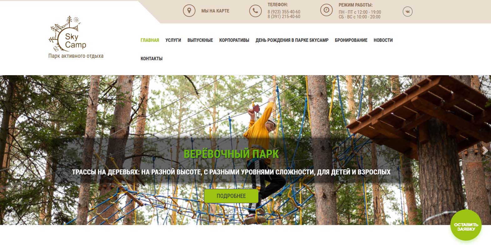 В этом парке скучать не получится! Веревочные трассы работают круглый год — можно лазать, как настоящий супергерой. Детей ждет гигантский лабиринт, тюбинговые горки, а самых смелых — троллей через реку на высоте 10-этажки! Зимой — катание на «банане» и снегоходах.