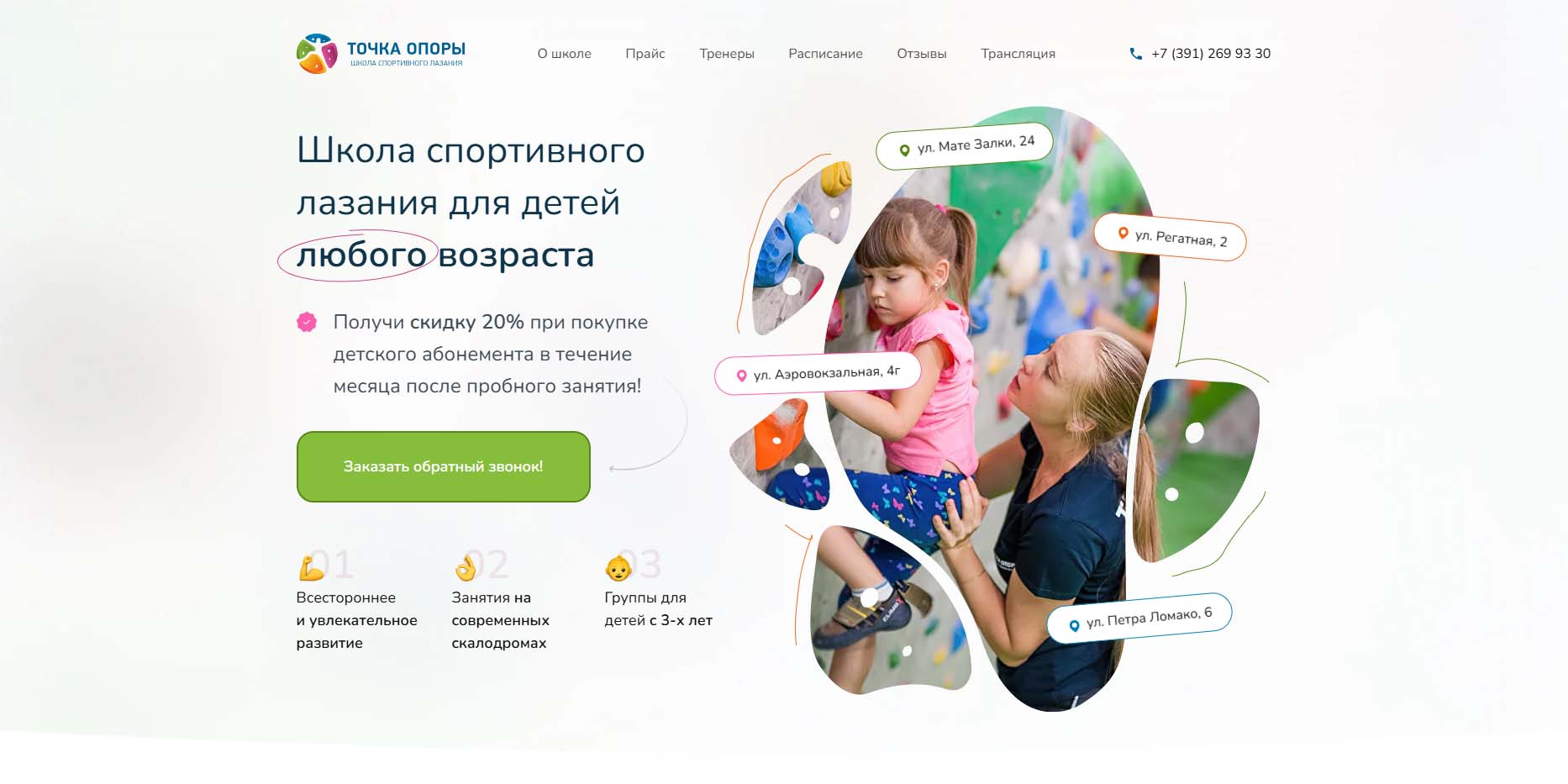 Настоящая кузница силы, ловкости и духа. Здесь ждут и малышей от 3 лет, и взрослых детей — каждому найдется подходящая группа. Можно прийти на разовое занятие или купить абонемент. Опытные тренеры помогут покорить любую вершину, даже если вы новичок в скалолазании.