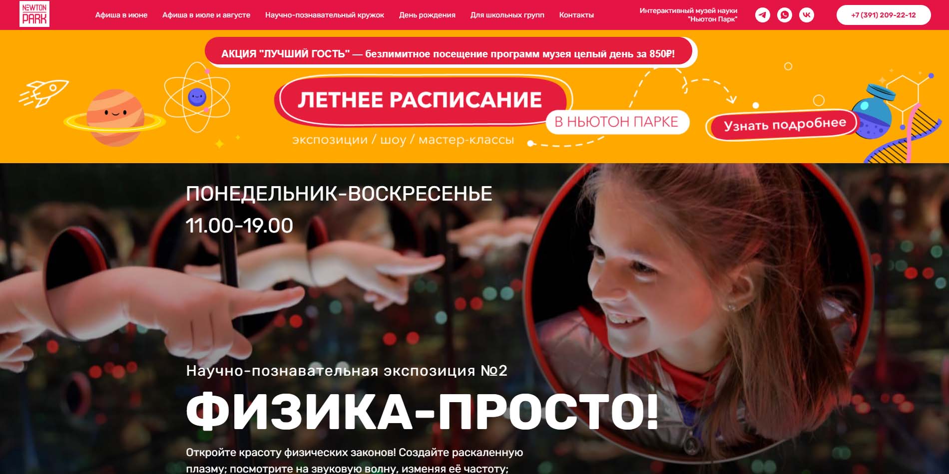 В парке ждут интерактивные экспонаты. Приготовьтесь увидеть поразительные иллюзии, а особое внимание — зеркальному лабиринту, выбраться из которого не так-то просто! Также в парке устраивают зрелищные научные шоу, где каждый может стать участником эксперимента. Алгебра, физика и химия здесь не скучные предметы, а веселое приключение.