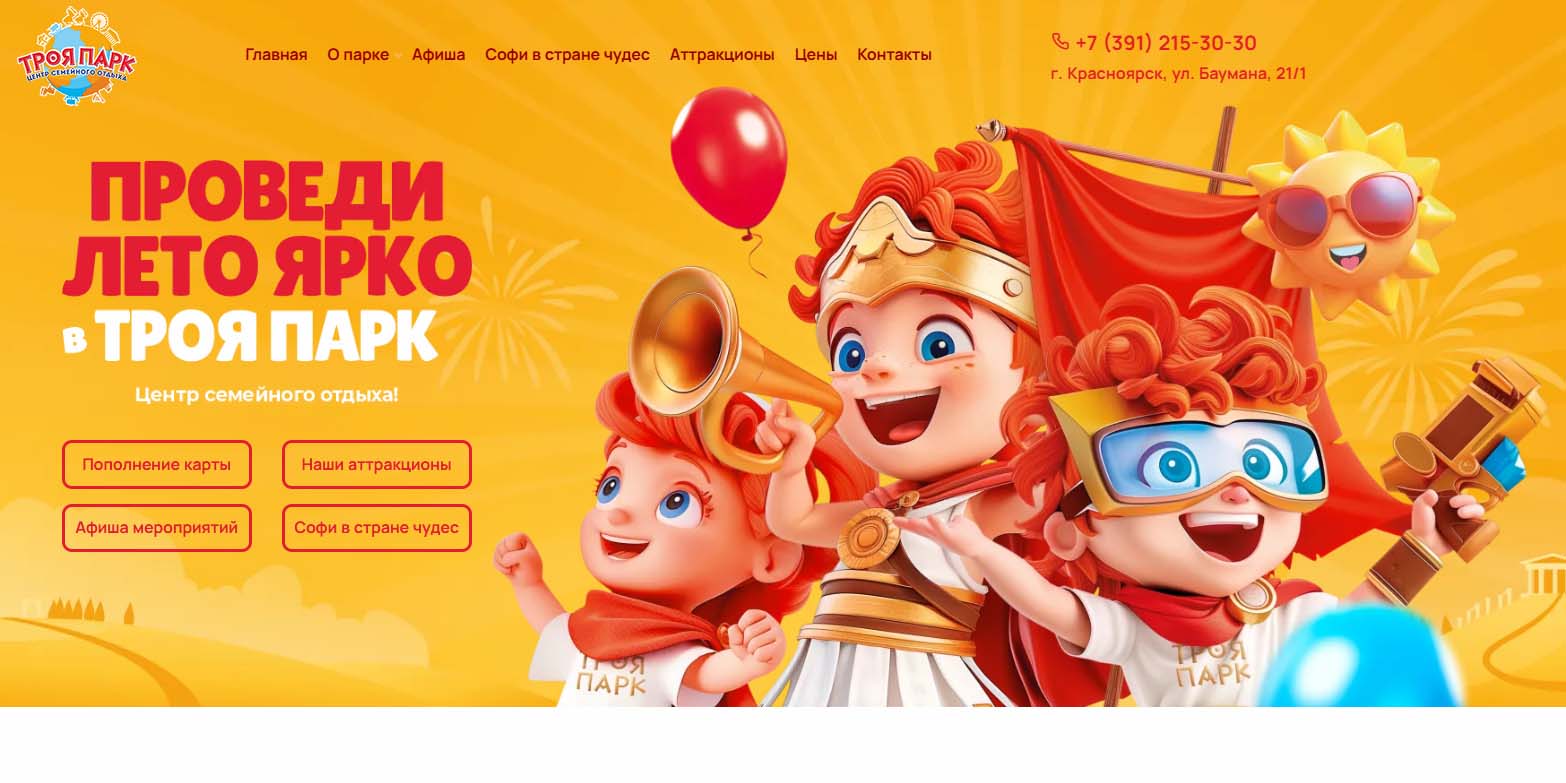 В теплый сезон это один из главных центров детских развлечений Красноярска. Здесь работают около 30 аттракционов: от песочниц и батутов для самых маленьких до веревочного парка, автодрома и американских горок для подростков. Главное, чтобы повезло с погодой: при дожде, сильном ветре или температуре ниже +10 ºC аттракционы закрываются.