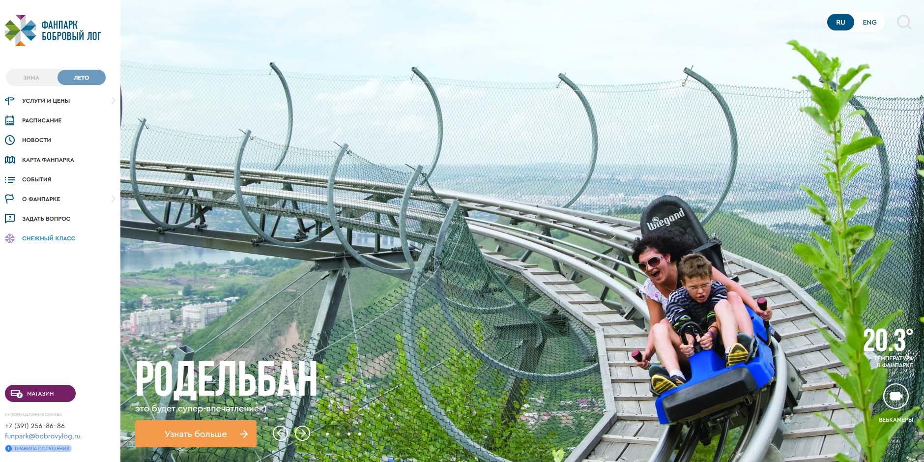 В любое время года здесь приятно гулять, кататься на канатке и по эко-тропе подниматься к панораме на Столбы. Детей особенно впечатлит родельбан — необычные сани на рельсах, разгоняющиеся до 45 км/ч. Похоже на американские горки, только с управлением. Эмоции — на всю жизнь.
