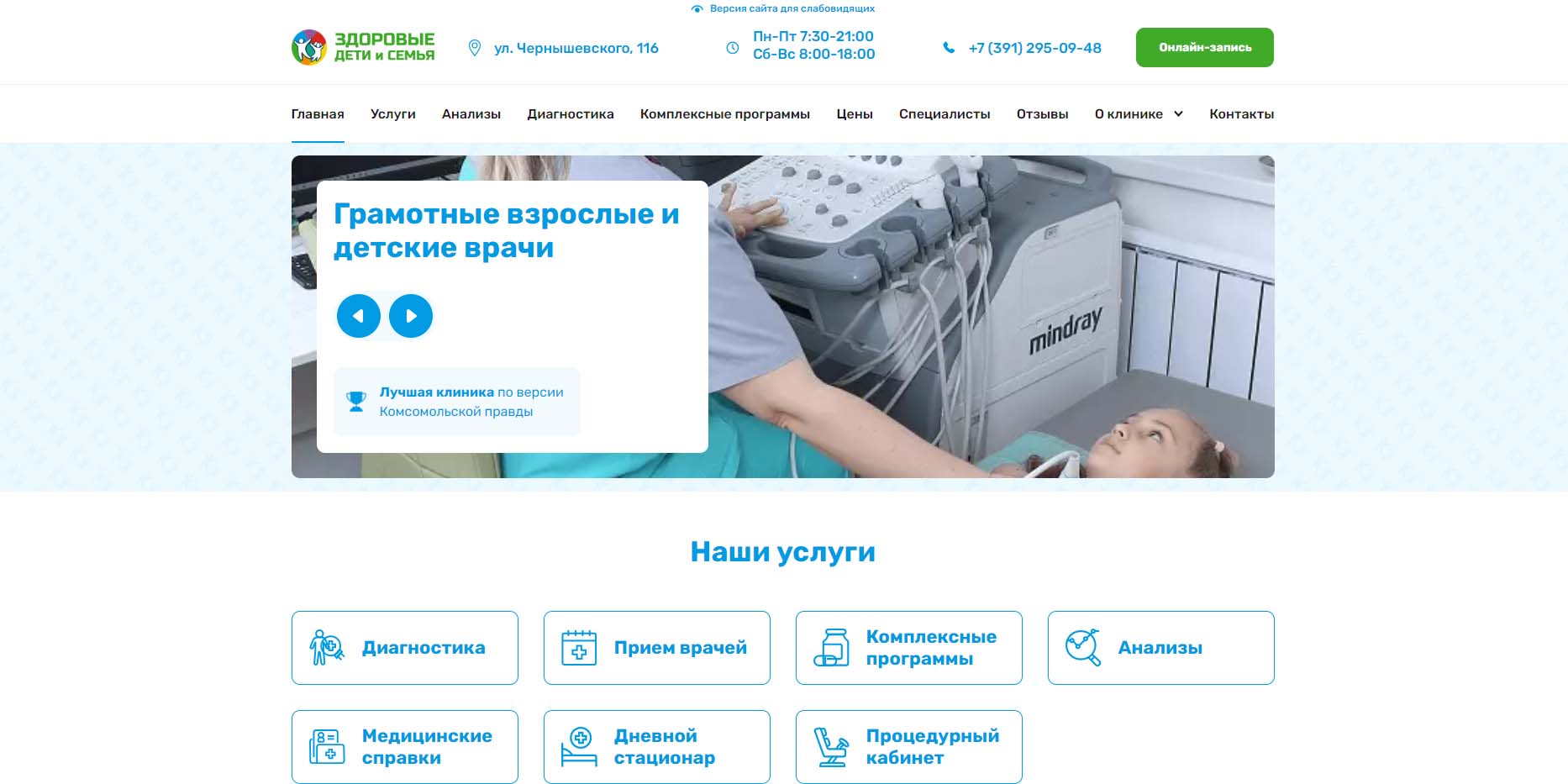 «Здоровые дети и семья» — многопрофильное медучреждение, работающее в Красноярске с 2017 года и позиционирующее себя как клиника классической, превентивной и восстановительной медицины. Здесь можно наблюдаться в любом возрасте с самого рождения. Для удобства пациентов разработаны позволяющие сэкономить комплексные программы медицинского обслуживания. Если больной не в состоянии приехать в медцентр, врачи готовы оказать помощь на дому. 80% числящихся в штате докторов — врачи первой или высшей категории, есть кандидаты наук. Клиника располагает дневным стационаром, а перечень видов и методов лабораторной диагностики практически бесконечный и включает редкие анализы.