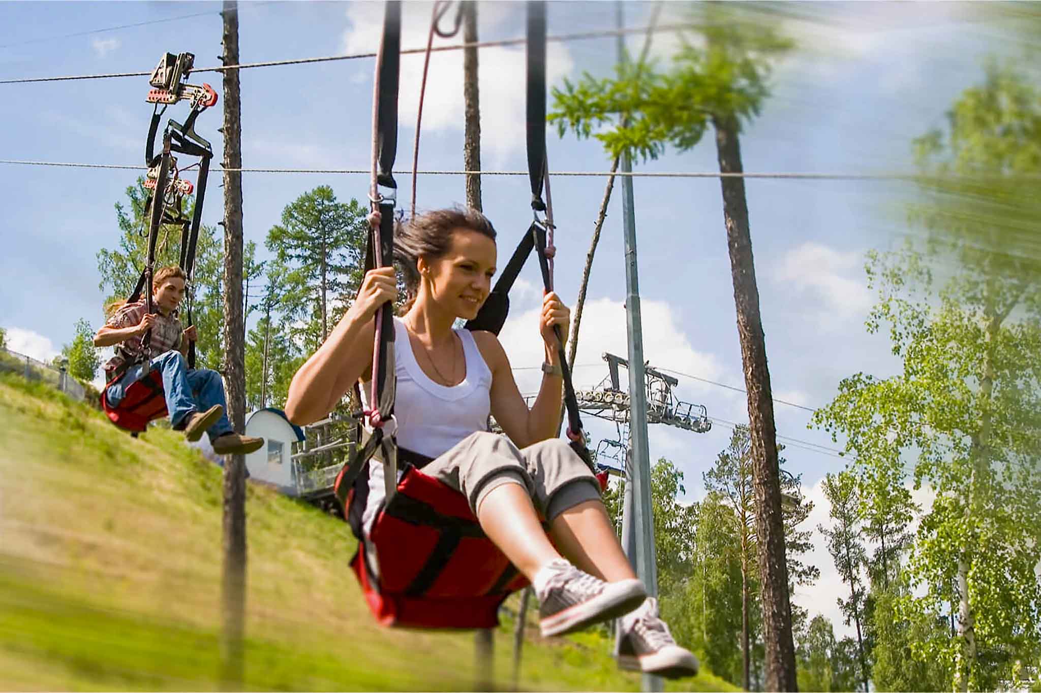 Увлекательный и волнующий полет в специальном снаряжении на тросе протяженностью 1000 метров со скоростью до 90 км/час. Услуга включает в себя: подъем на вершину на канатной дороге и спуск в специальном снаряжении. На аттракцион допускаются только те, кому есть 14 лет. Кстати, это прекрасная возможность увидеть нацпарк «Столбы» во всей красе. Отправляйтесь на канатно-кресельной дороге фанпарка «Бобровый лог» наслаждаться зеленой тайгой и причудливыми скалами. Маршрут займет около 2 часов. Добраться до остановки фанпарка можно на автобусе №37 или на такси.
