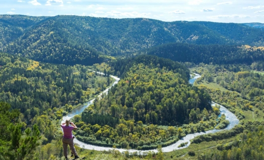 В 45 км от Красноярска в Березовском районе река Есауловка делает резкий поворот, образуя широкую и почти симметричную петлю. К этому удивительному месту проложен пешеходный маршрут с выходом на одноименную смотровую площадку. Поход до Есауловской петли — это возможность познакомиться с тайгой в комфортных условиях и сделать захватывающие дух фотографии.