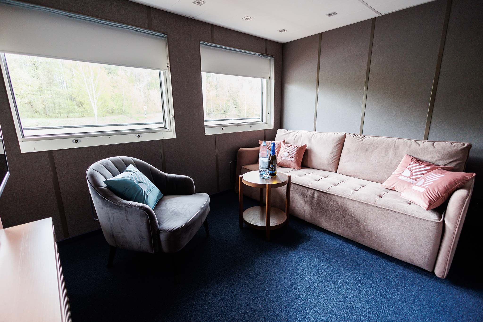 Все каюты на теплоходе FUN&SUN CRUISE Нижний Новгород оборудованы так, чтобы путешественник не испытывал вообще ни малейших неудобств в сравнении с «сухопутным» номером. У вас будет абсолютно все (и даже немножко больше), что можно найти в хорошем отеле, начиная от халатов (в большинстве вариантов размещения) и до комплимента в виде бутылочки игристого для люксов. В люксах, кстати, есть не только игристое и чайник, но даже своя кофемашина. Про кондиционер, Wi-Fi, ежедневную уборку и подготовку номера ко сну можно и не говорить, эти услуги в круизах туроператора обязательны. Ну а в качестве милой приятной мелочи — небольшие брендированные мини-шоколадки!