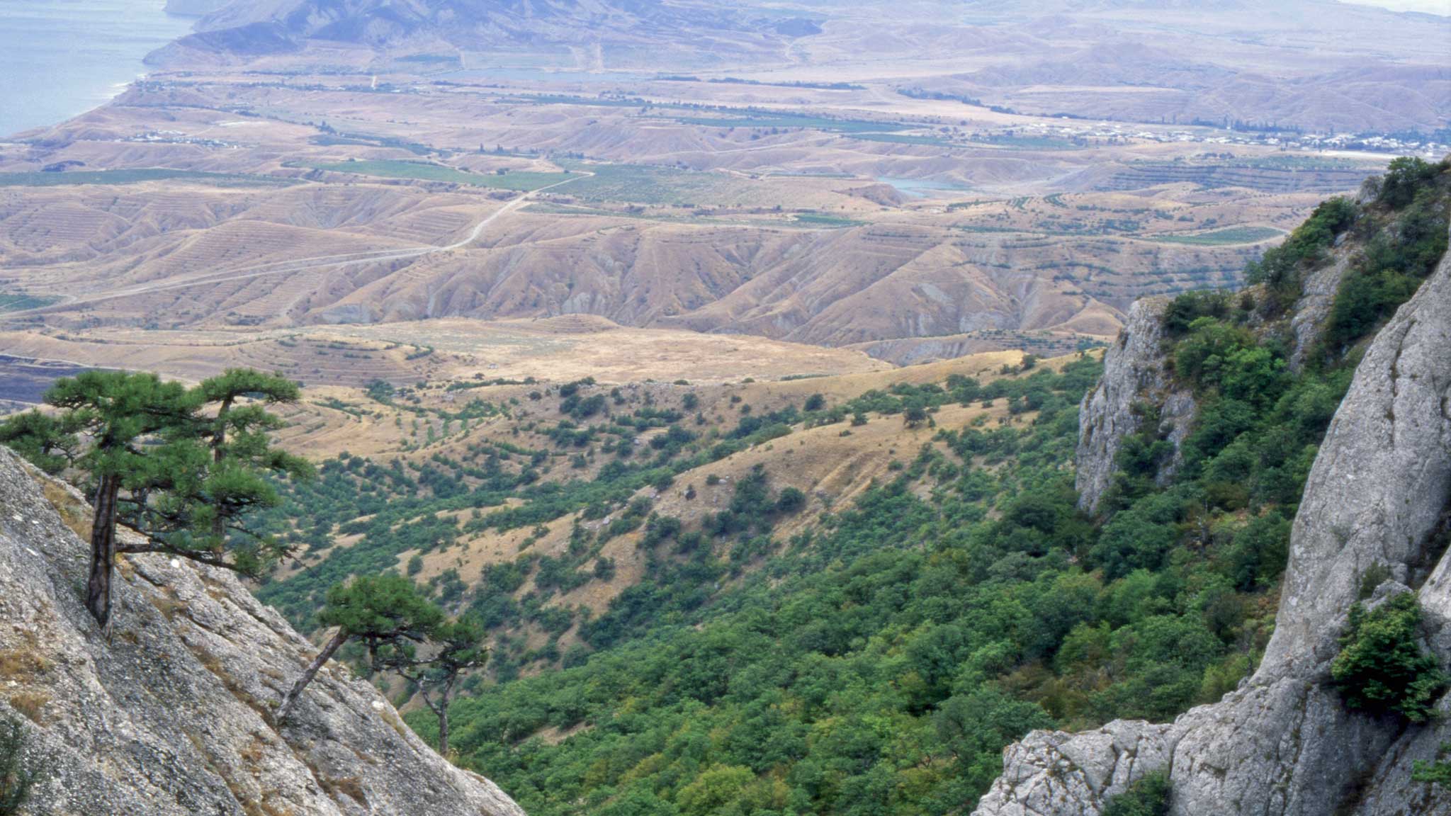 Лес на Карадаге представлен дубами пушистым и скальным, буками и грабами, но большей частью его склоны покрыты одиночными деревьями и кустарниками.