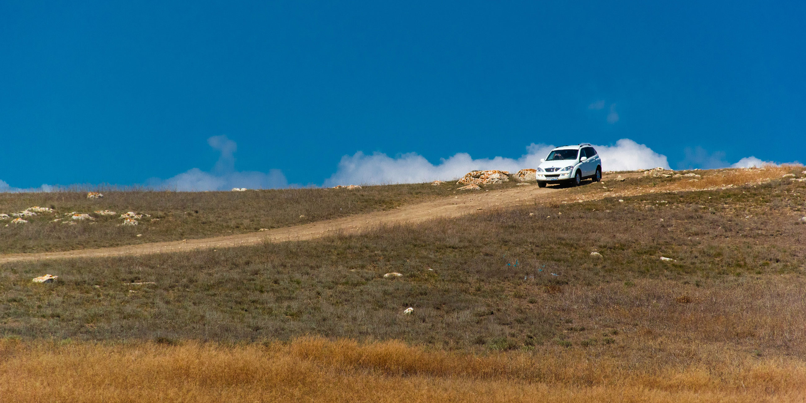С мыса Опук. Вы наверняка видели эти фантастические снимки, будто с другой планеты: бирюзовое море, светлая полоска узкого пляжа и лавандово-коралловое озеро, разделенное на две части. Дорога в гору там крутая, поэтому многие туристы оставляют машины и идут на смотровую пешком.