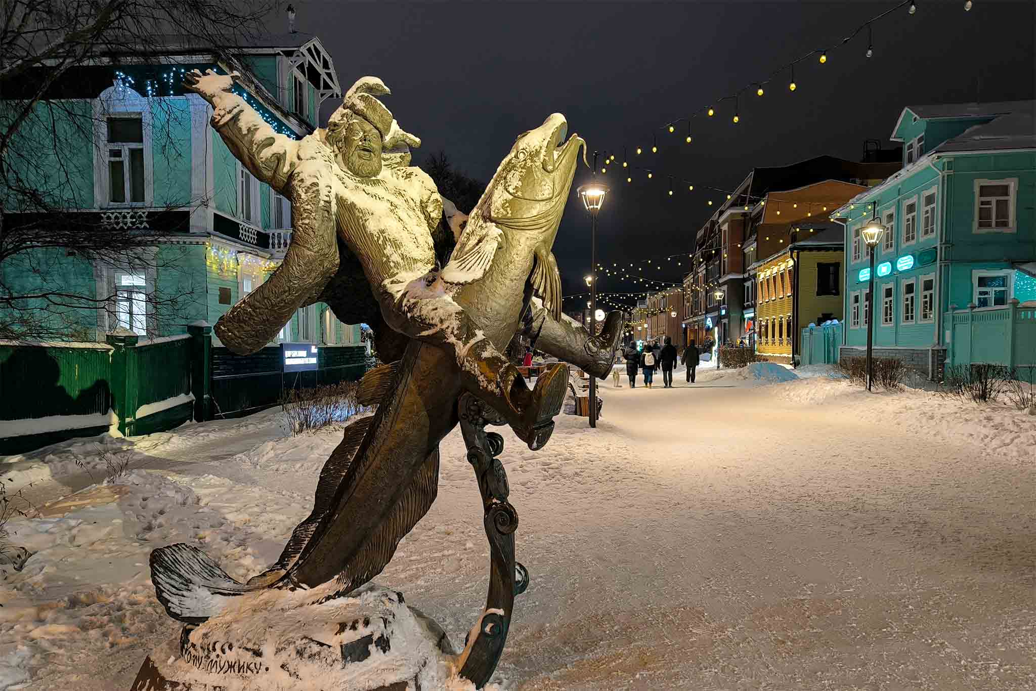 Набережная Северной Двины с кораблями также не оставит никого равнодушным. Здесь с детьми можно устроить квест и найти фигурки кудесников. Это бронзовые человечки отражают историю и обычаи коренных народов Поморья. Так, есть кудесник-трескоед, есть с птицей счастья, со свистулькой, с пряником-козулей.