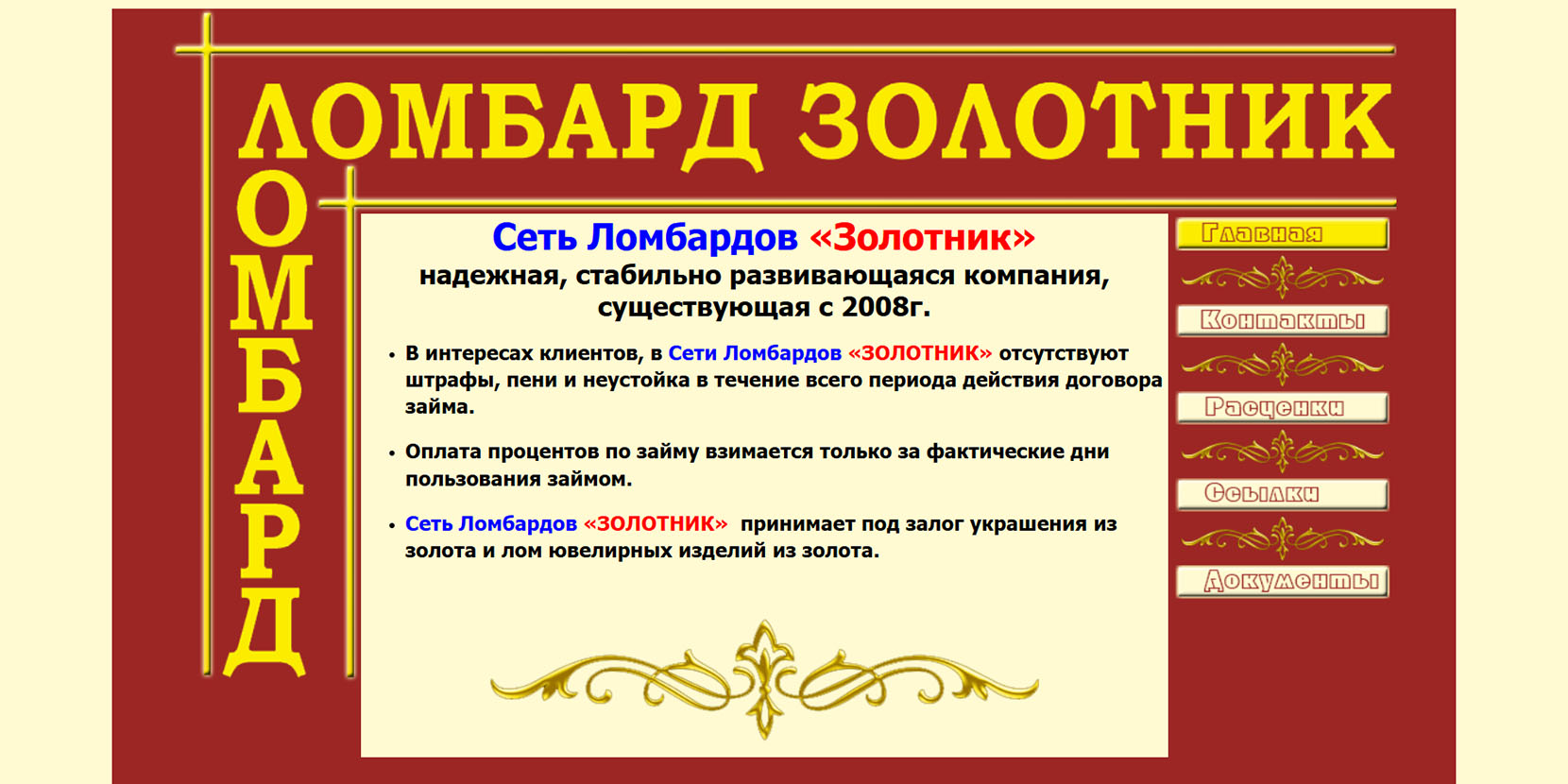 Эта сеть ломбардов работает с 2008 года. В компании отсутствуют штрафы, пени и неустойки на протяжении всего срока действия договора. Проценты начисляются только за фактические дни пользования займом. «Золотник» принимает под залог украшения из золота и лом золотых ювелирных изделий. Срок займа — от 1 до 30 дней с дополнительным льготным периодом в 30 дней.