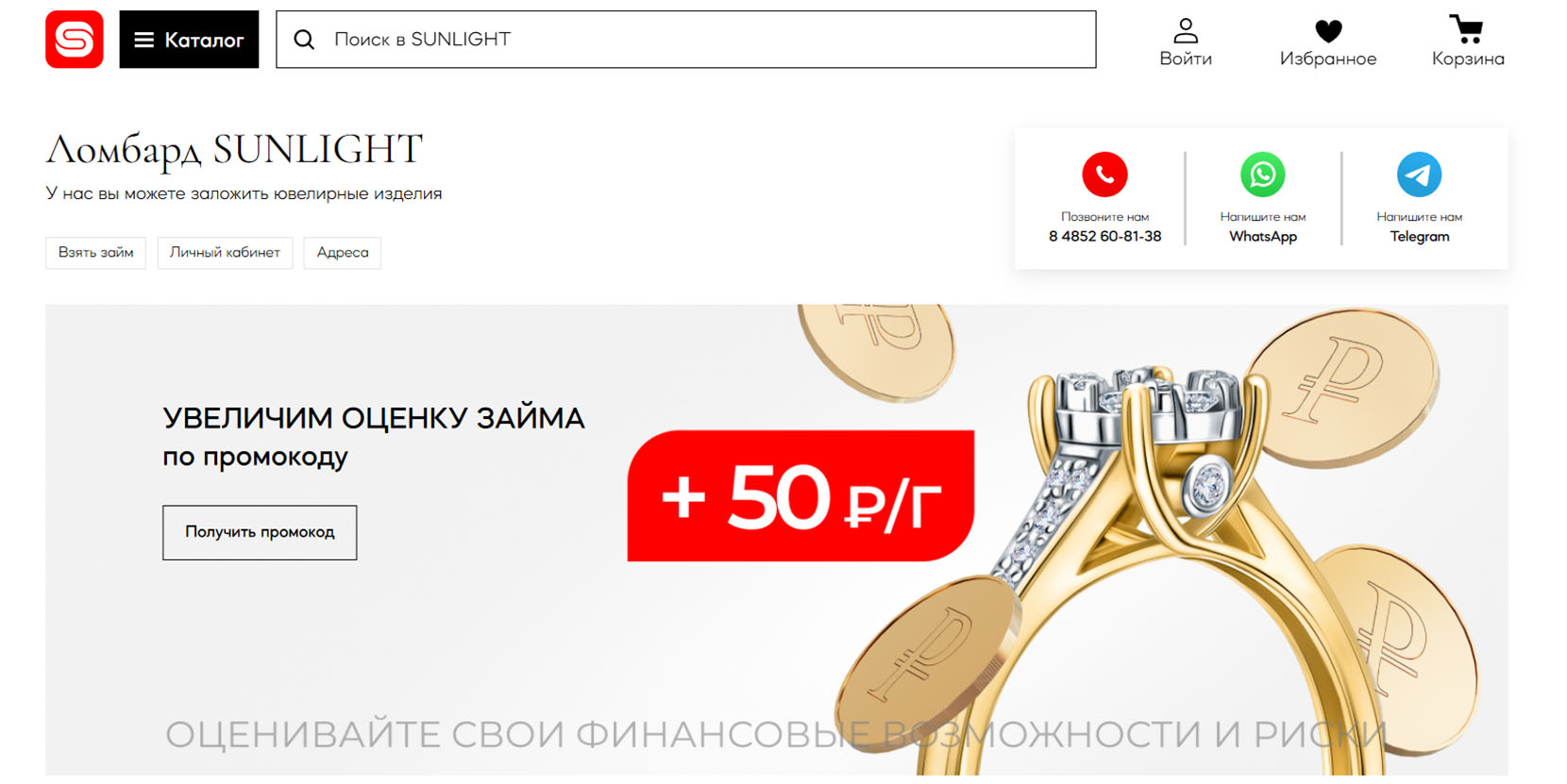 Ломбард Sunlight предлагает быстрые займы под залог ювелирных украшений без справок и поручителей. В Кургане работают два филиала этой федеральной сети. Процесс получения займа максимально простой: приносите украшение, получаете оценку и деньги в день обращения. Здесь можно сразу продать украшение, что увеличит его стоимость.