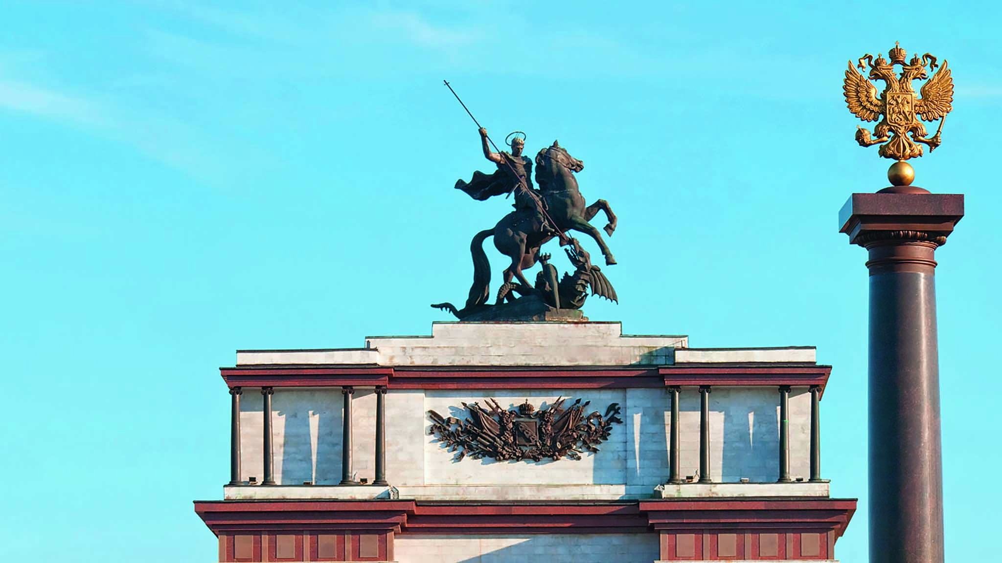 Величественная постройка высотой 24 м на северном въезде в Курск — одна из визитных карточек города. Мраморную арку построили в 1998–2000 годах, а ее открытие приурочили ко Дню Победы. У подножия архитектурного памятника на постаментах стоят древний воин, гренадер, пехотинец и танкист времен Курской битвы, а наверху — фигура Георгия Победоносца на коне.