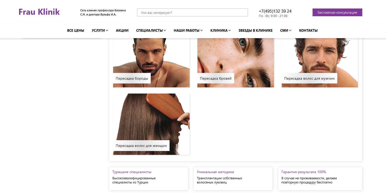 Frau Klinik была основана известными хирургами: профессором Сергеем Блохиным и доктором Игорем Вульфом — одними из первых пластических хирургов СССР. Здесь делают пересадку волос мужчинам и женщинам. Все манипуляции проводятся с минимальной травматичностью. В клинике работают высококвалифицированные специалисты с большим опытом.