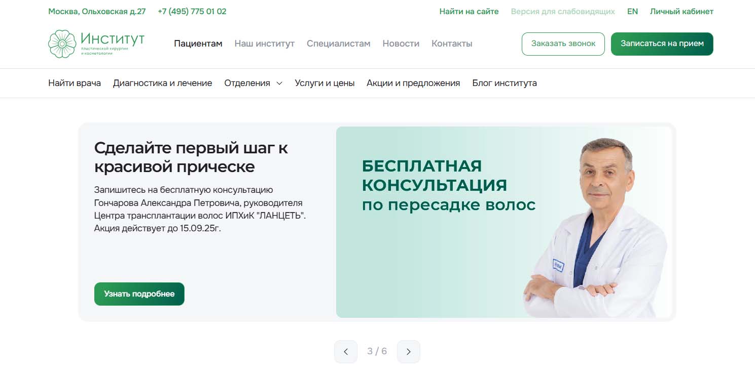 Институт входит в число самых крупных научных учреждений в России, Европе и мире, здесь работают высококлассные пластические хирурги. В ИПХиК проводят трансплантацию волос традиционным методом — Strip-шовным (лоскутным), иначе FUT и бесшовным методом FUE, когда волосы извлекаются при помощи роторного механизма и пересаживается в зону облысения. Перед операцией клиент приходит на консультацию, где врач оценивает объем работ и определяет оптимальную методику. Стоимость пересадки зависит от методики, сумма рассчитывается за один графт.