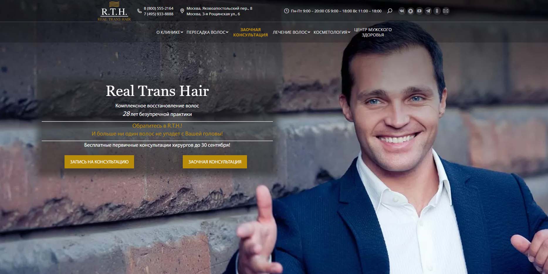 «Обратитесь в R.T.H.! И больше ни один волос не упадет с вашей головы!» — формула московской клиники, которая уже больше 25 лет оказывает услуги в области трансплантации и восстановления волос. В работе с пациентами используют методы STRIP и FUE. Волосы для пересадки берутся из донорской зоны в височной и затылочной частях головы, где фолликулы устойчивы к воздействию гормона дигидротестостерона, а следовательно, к выпадению. Каждый пациент получает письменную гарантию на рост пересаженных волос. Стоимость пересадки волос в клинике R.T.H. всегда рассчитывается индивидуально, есть гибкая шкала скидок.