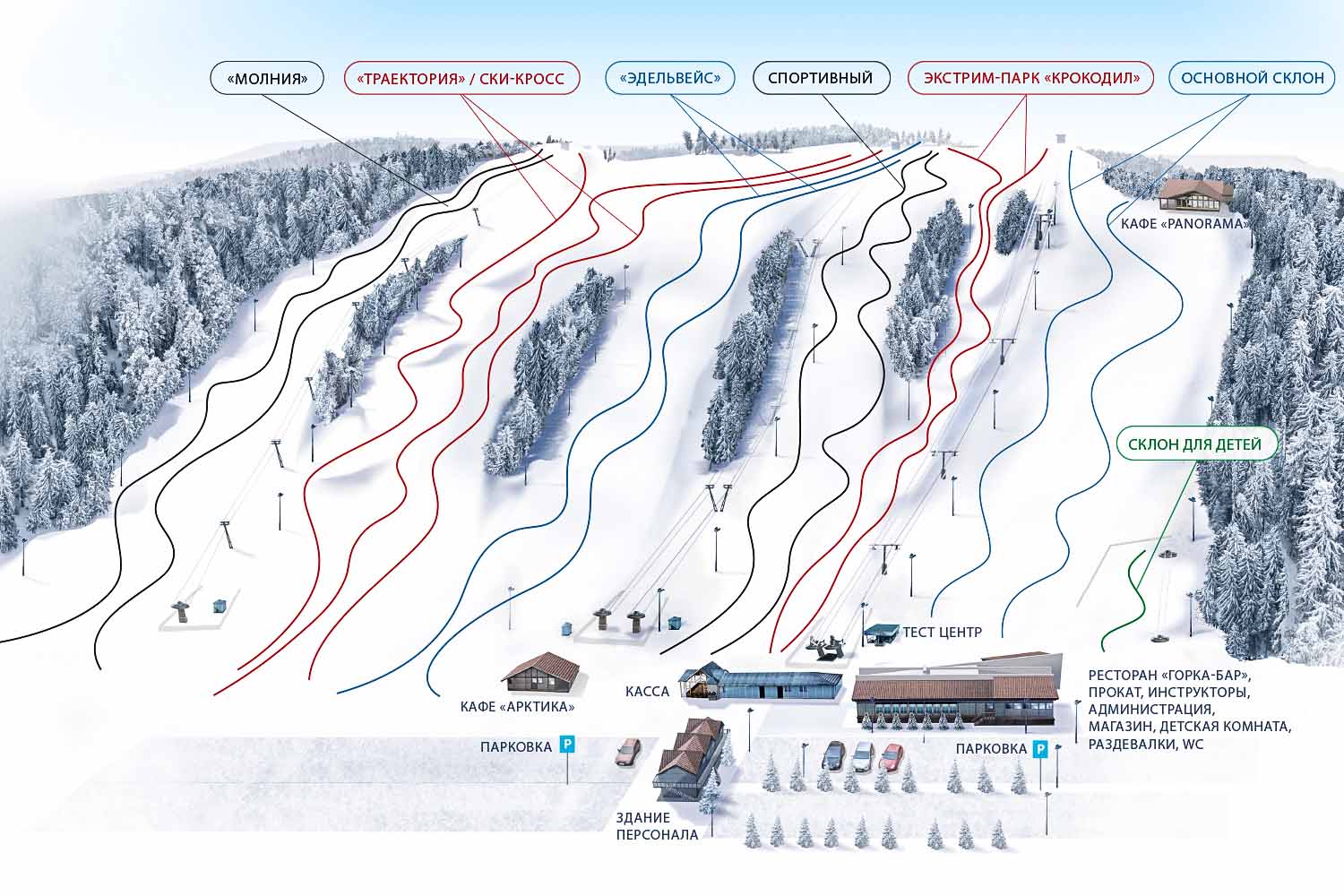 Для детей и начинающих огорожена зона обучения с отдельным подъемником. Для любителей острых ощущений готовится фан-парк с трамплинами и фигурами. Кроме того, есть специальная трасса для ски-кросса, на которой может прокатиться и любитель. Все склоны хорошо освещены, поэтому организовано вечернее катание.