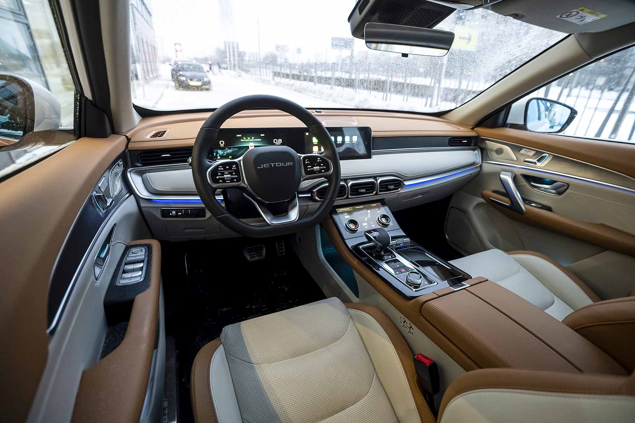В нашей машине вертикальный дисплей с диагональю 10,4 дюйма вписан в консоль, плавно переходящую в центральный тоннель. Часть функций сенсорного дисплея продублирована физическими кнопками под ним: обдув салона и лобового стекла, аварийка, подогрев заднего стекла и переключение режимов вождения. Остальной функционал – сенсорный.