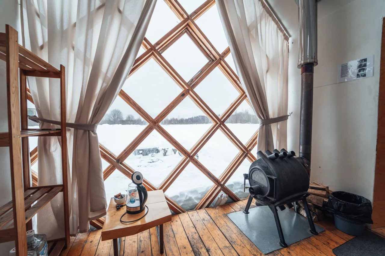 Здесь сочетается красота нетронутой природы и городской комфорт. Домики-глэмпы оборудованы всем необходимым: кровати с анатомическими матрасами, душ и туалет, а теплый пол и дополнительный конвектор не дадут замерзнуть. Через панорамное окно открывается вид на зимний лес. На террасах домиков есть гриль и кресла.