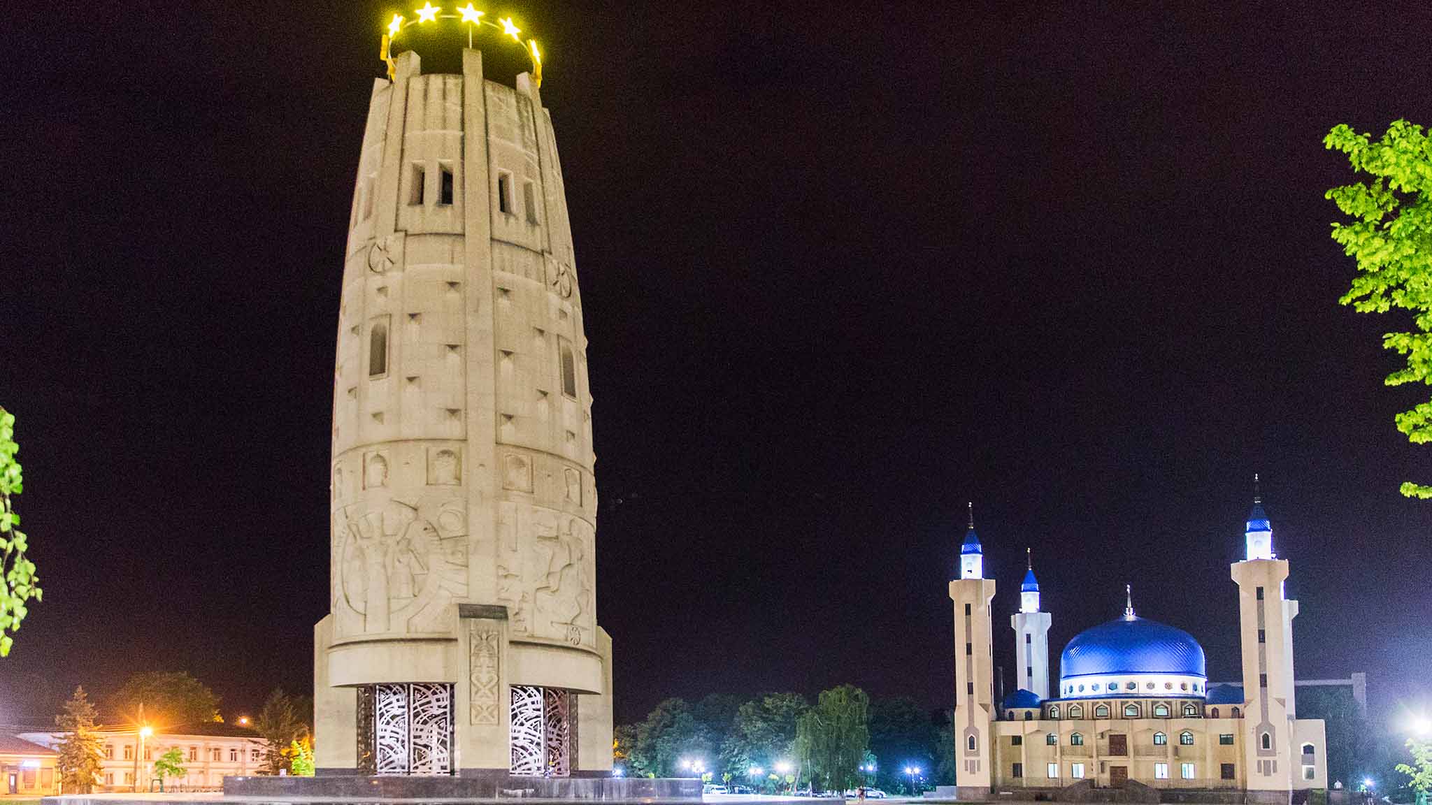 20-метровый памятник жертвам Кавказской войны был открыт в 2013 году на площади рядом с мечетью как символ единства всех проживающих в республике народов. Официальное название монумента — памятник Единения и согласия. Оригинальное сооружение состоит из пяти ярусов. В самом низу расположен очаг, основа адыгской культуры. Второй ярус занимают сцены из народных легенд и сказаний, над ними расположены барельефные портреты выдающихся представителей народа, выше — «каменное поле». Венчают монумент три стрелы и двенадцать золотых звезд — древние адыгские символы.