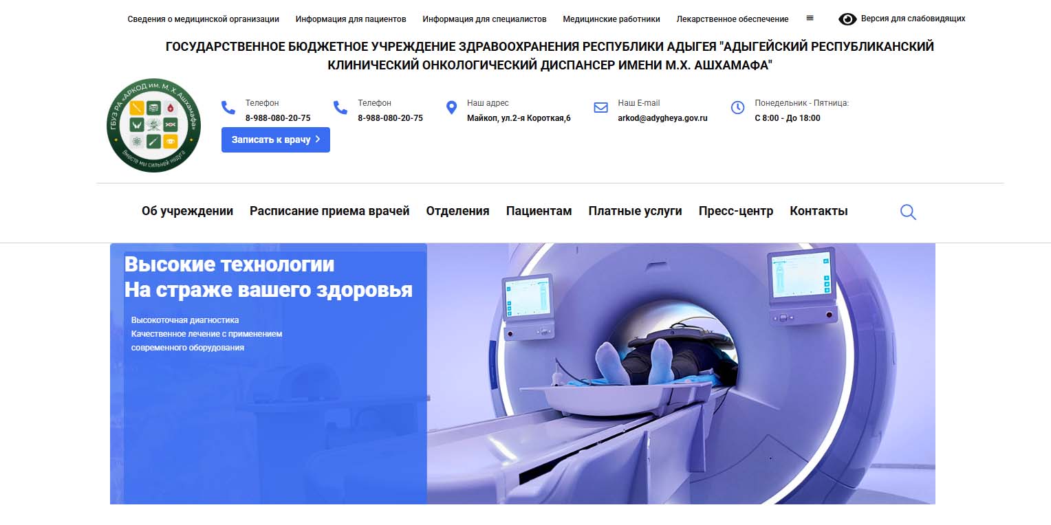 Началом отсчета истории медучреждения можно считать 1945 год, когда открылась онкологическая служба, в 1972 году — это уже Адыгейский областной онкологический диспансер. В настоящее время одним из отделений медучреждения является отделение рентгеновской и ультразвуковой диагностики, где с 2021 года функционирует система диагностики МРТ всего тела со сверхпроводным магнитом. Проводят сканирование в ускоренном режиме в комфортных для пациента условиях.