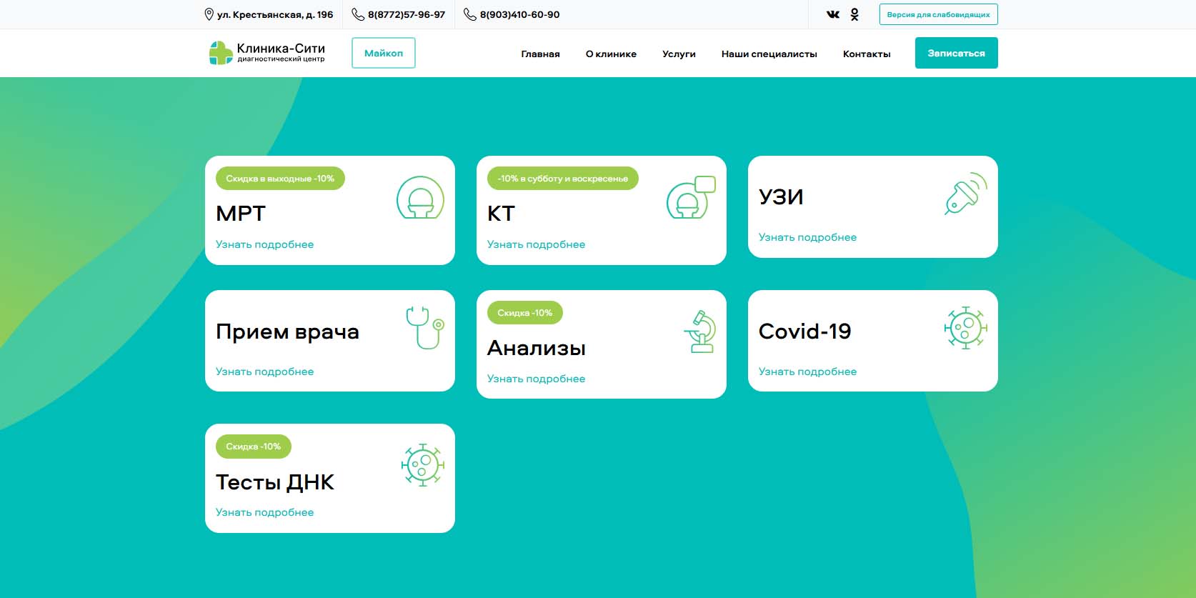 Федеральная сеть диагностических центров. В филиале в Майкопе МРТ проводится на сертифицированном высокопольном томографе. Можно пройти исследование как одного органа или системы органов, так и комплексное («Головная боль», «Два сустава», «Онкопоиск» и другие), МРТ с контрастом. Среди юных пациентов первое место по распространенности занимает МРТ мозга, способная выявить гидроцефалию, аневризму, эпилепсию и ряд других серьезных заболеваний и состояний.