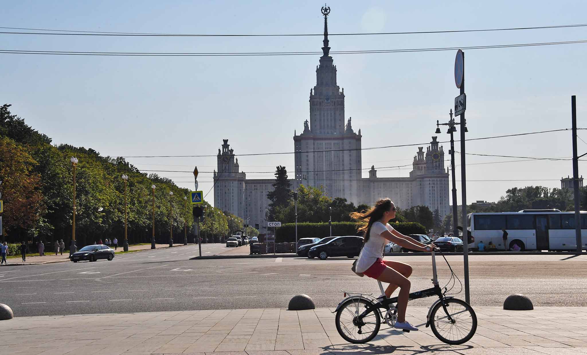 Маршрут называют «академическим»: потому что проходит вдоль университетского городка и занимает около 45 минут. Велодорожка начинается от станции метро «Университет» — вдоль улицы Колмогорова. Вы окажетесь позади главного корпуса МГУ и приедете к Ботаническому саду вуза. Далее можно обогнуть высотку и выехать к смотровой площадке на Воробьевых горах.