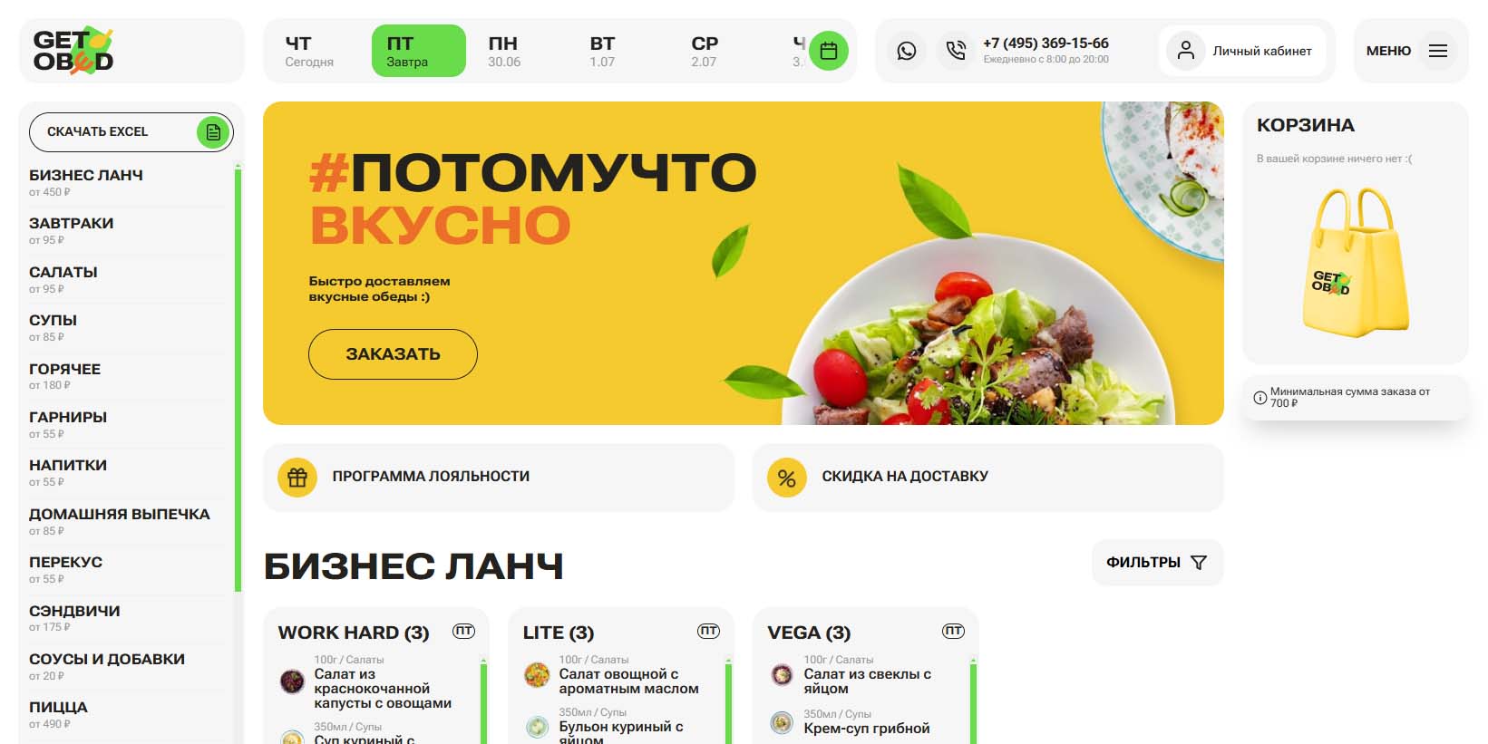 Сервис позиционирует себя как доставку вкусных обедов, однако в меню есть и завтраки, и бизнес-ланчи, и домашняя выпечка, а время доставки можно сдвинуть на удобное. Здесь нельзя заказать еду, к примеру, сразу на неделю – ежедневно до 17.00 принимаются заказы на следующий день. Меню очень близко к тому, что есть в обычных кафе и столовых, хотя есть варианты и для любителей изысков: том ям, салат с авокадо и лососем и прочее. Доставка возможна и за пределы МКАД.