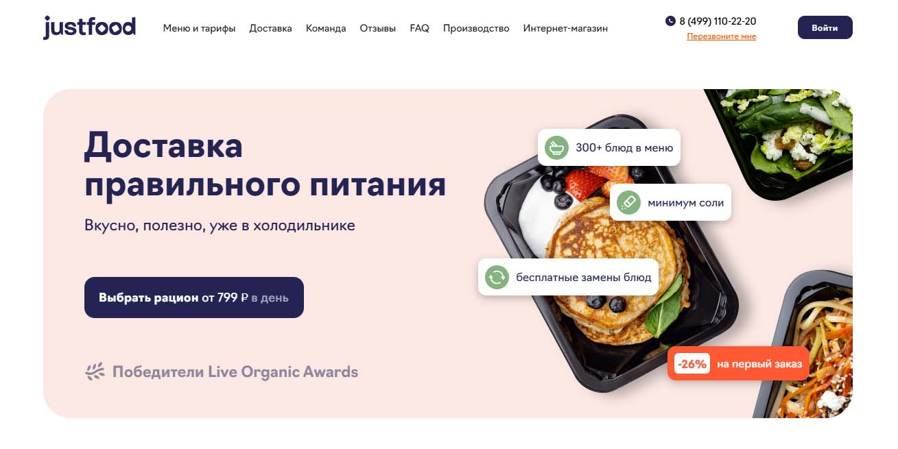 | JustFood | 11 676 руб. за рацион из пяти блюд на неделю (линейка «Разнообразное») |