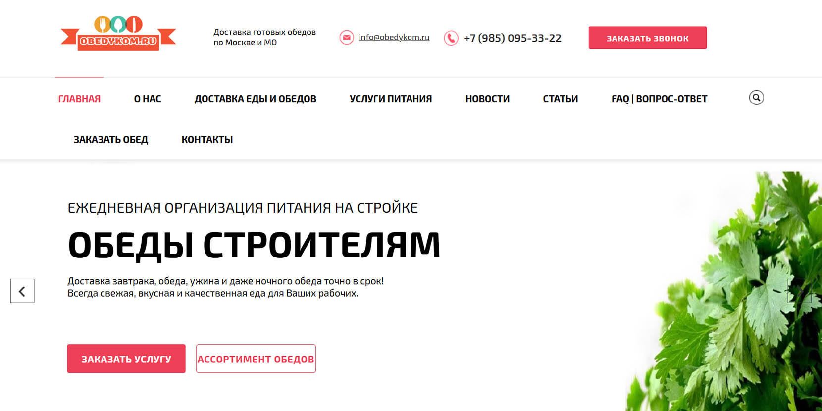 Компания доставляет готовые обеды на строительные объекты больше 10 лет. В меню широкий выбор комплексных обедов, в том числе вегетарианских и халяль. Ассортимент обновляется еженедельно. Еду привезут горячей в герметично закрывающихся контейнерах. Меню для каждой компании разрабатывается индивидуально с учетом сферы деятельности. Первый пробный обед — бесплатно.