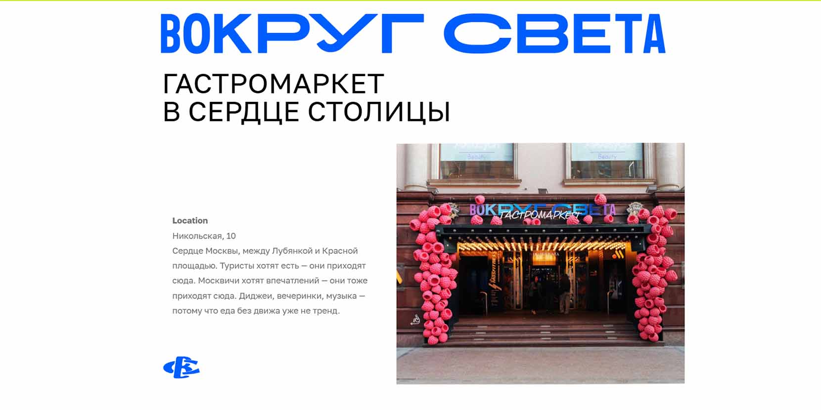 Один из лучших фудкортов Москвы расположен в конце пешеходной Никольской. Гастрономическое пространство организовало известное трио рестораторов: Борис Зарьков, Аркадий Новиков и Владимир Мухин. По задумке создателей, на ограниченном пространстве гость должен совершить гастротур по миру. Здесь более 30 заведений. Есть восточная, израильская, европейская кухни.