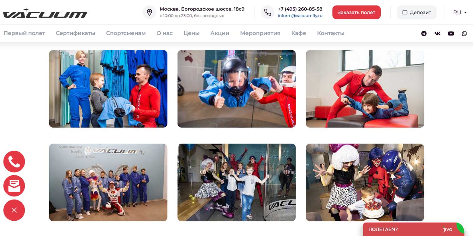 Здесь расположена одна из лучших аэротруб в Москве. Восходящие потоки воздуха позволяют имитировать прыжок с парашютом. Детям можно летать с четырех лет. Есть зрительская зона, откуда можно делать фото. Всем выдают фирменные комбинезоны.