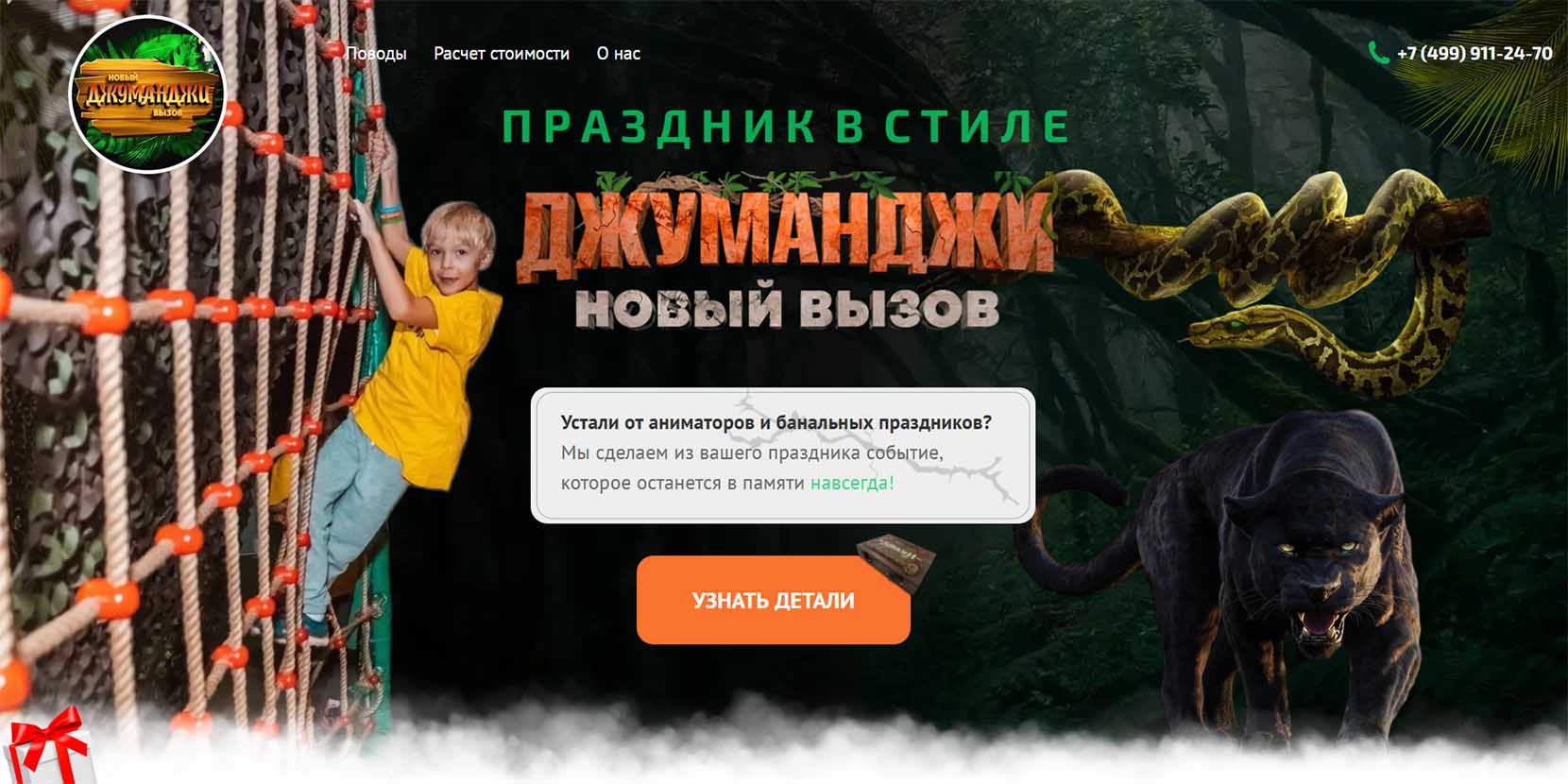 Организаторы обещают, что день рождения в Джуманджи ребенок запомнит на всю жизнь, и что интересно будет всем — от мала до велика. Праздник готовится под ключ, родителям нужно выбрать только основные моменты. В программе — шоу, банкет и дискотека.