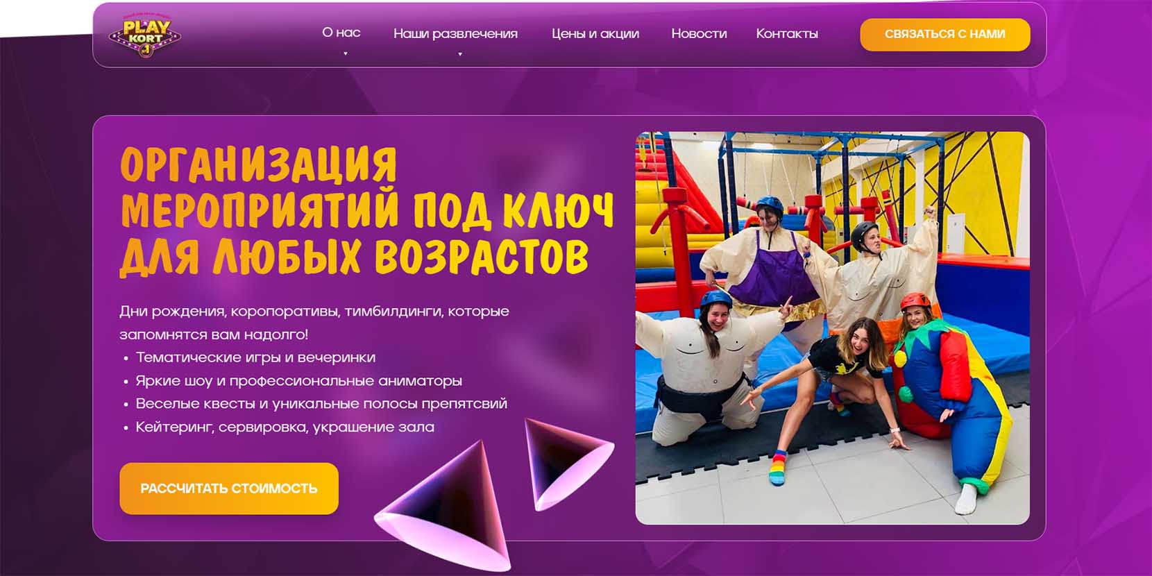 Для детского дня рождения здесь подготовили 40 программ и 65 шоу. Ориентированы на разный возраст участников. Есть для именинников от 3 до 14 лет. Центр комплекса — батутная арена. Есть скалодром, веревочный парк и слэклайн — это балансирование на натянутой веревке. Можно заказать аниматоров.