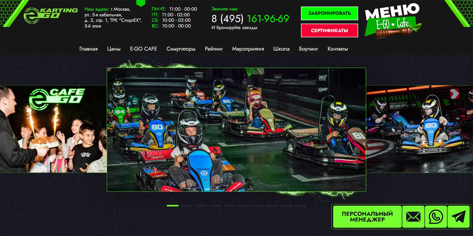 Какой мальчишка не мечтает о дне рождения в атмосфере гонок будущего? Эту мечту можно исполнить. И для девчонки, кстати, тоже. Шикарный парк новейших электрокаров. Безопасная для детей трасса, но все же интересная: с перепадом высот. А после полученных впечатлений, когда аппетит разгуляется, можно подкрепиться вкусненьким в кафе, а отдохнуть — любуясь видами со смотровой площадки. Завершить праздник можно боулингом и гоночными симуляциями. Для самых маленьких гостей есть игровая комната, никому не будет скучно.