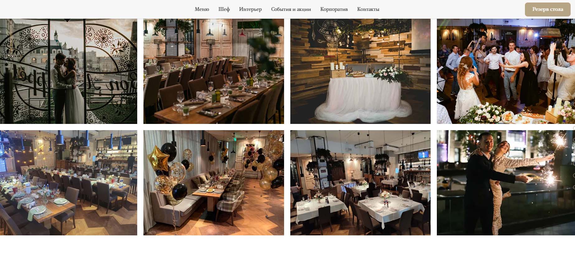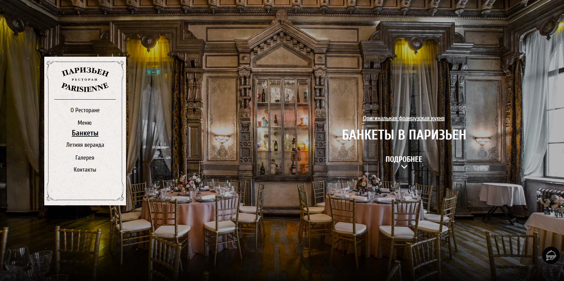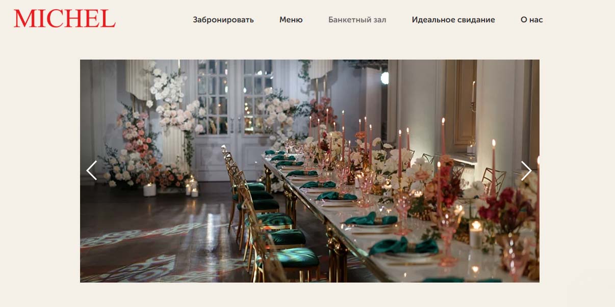 В «Белом зале» ресторана настроение пространства задают хрустальные люстры и изящная лепнина. В роскошном «Красном зале» взгляд молодоженов будет радовать кирпичная кладка, арочные окна и стильный винтаж. На каждом столе организаторы разместят канделябры, предоставят в пользование световое и музыкальное оборудование под руководством своего технического специалиста. В меню — традиционная европейская кухня с французскими нотками. Приятным сюрпризом для молодоженов станет подарок от ресторана — ночь в отеле Chez Michel.