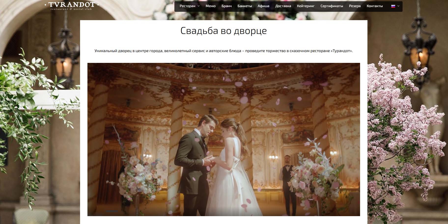 Не почувствовать себя королем в интерьерах этого ресторана просто невозможно. В 12 залах представлены разные дворцовые стили — от ренессанса до неоклассицизма и от барокко до шинуазри. «Турандот» считается одной из самых романтических площадок для проведения свадеб. В ресторане доступна выездная регистрация, например, во Флорентийском дворике или на Трельяжной террасе. В отдельных залах могут разместиться до 300 гостей. В качестве бонуса ресторан предоставляет бесплатный валет-паркинг для гостей мероприятия.