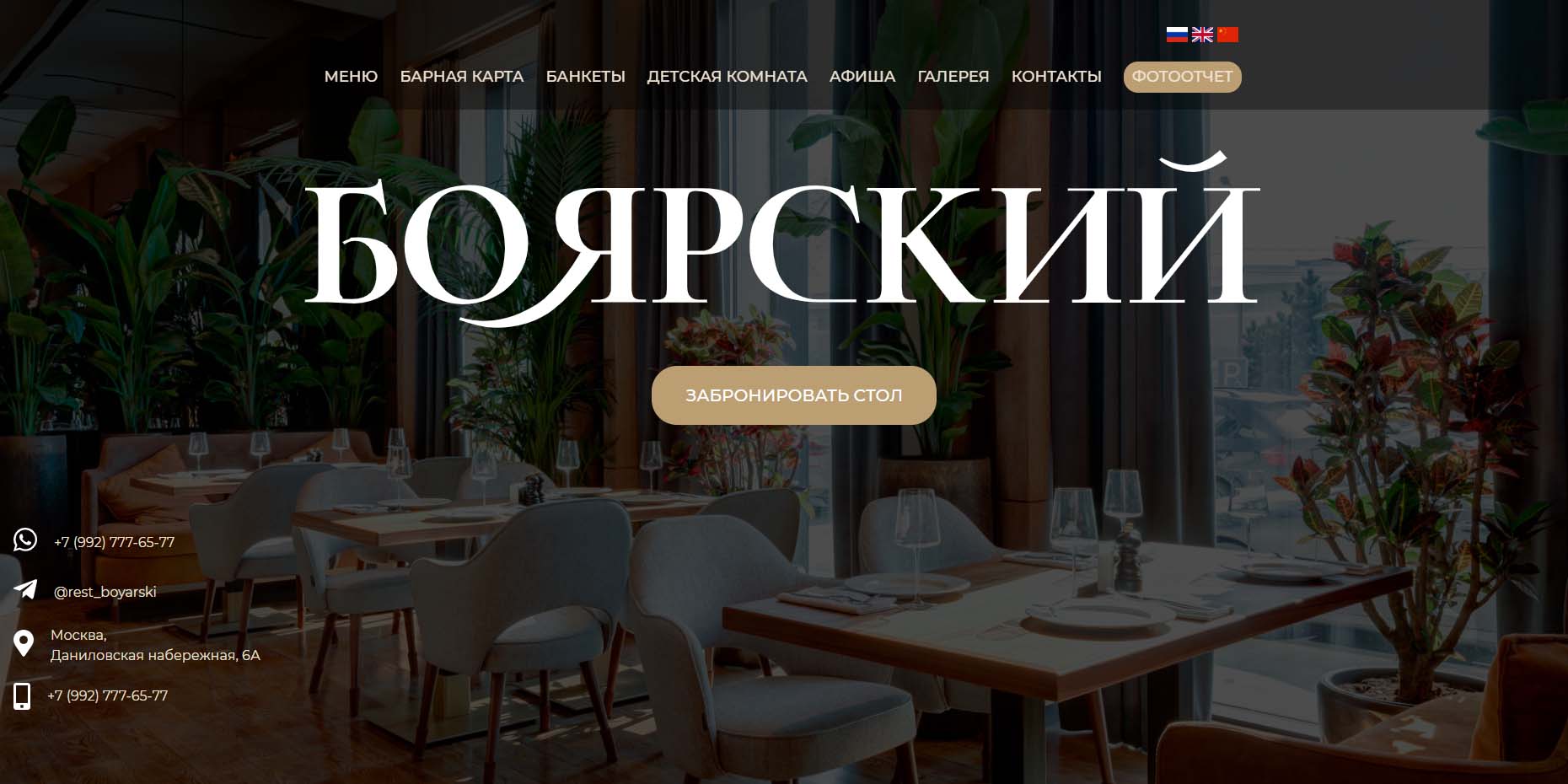 Ресторан с панорамным видом на набережную Москва-реки. Здесь помогут организовать и спланировать свадебный день так, чтобы были учтены все пожелания жениха и невесты. В ресторане на выбор есть пять залов и веранда. Вместимость — от 8 до 200 человек. Большое преимущество этой площадки для свадьбы — наличие детской комнаты с аниматорами.